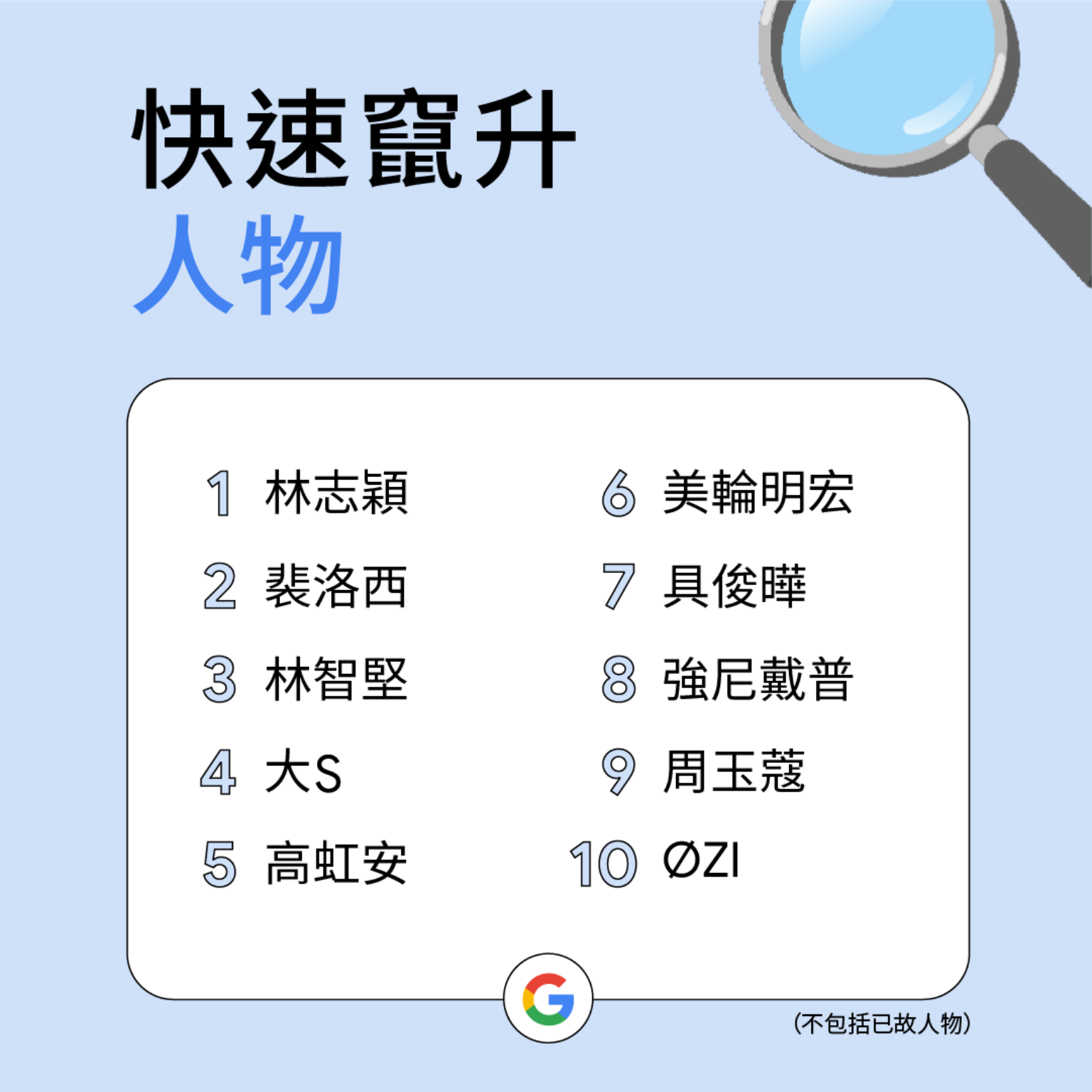 Google採計去年12月至今年11月底期間的搜尋量快速竄升幅度進行排名。快速竄升人物排行榜反映台灣網友對影視娛樂的高度關注,上榜的藝人有今年7月發生重大交通事故的「林志穎」、靠20年沒換的電話號碼再度牽起緣分的「大S」、「具俊曄」雙雙在榜上,還有年初網傳將手機或電腦桌布換成日本資深藝人美輪明宏能帶來好運,也讓「美輪明宏」相關搜尋快速竄升。