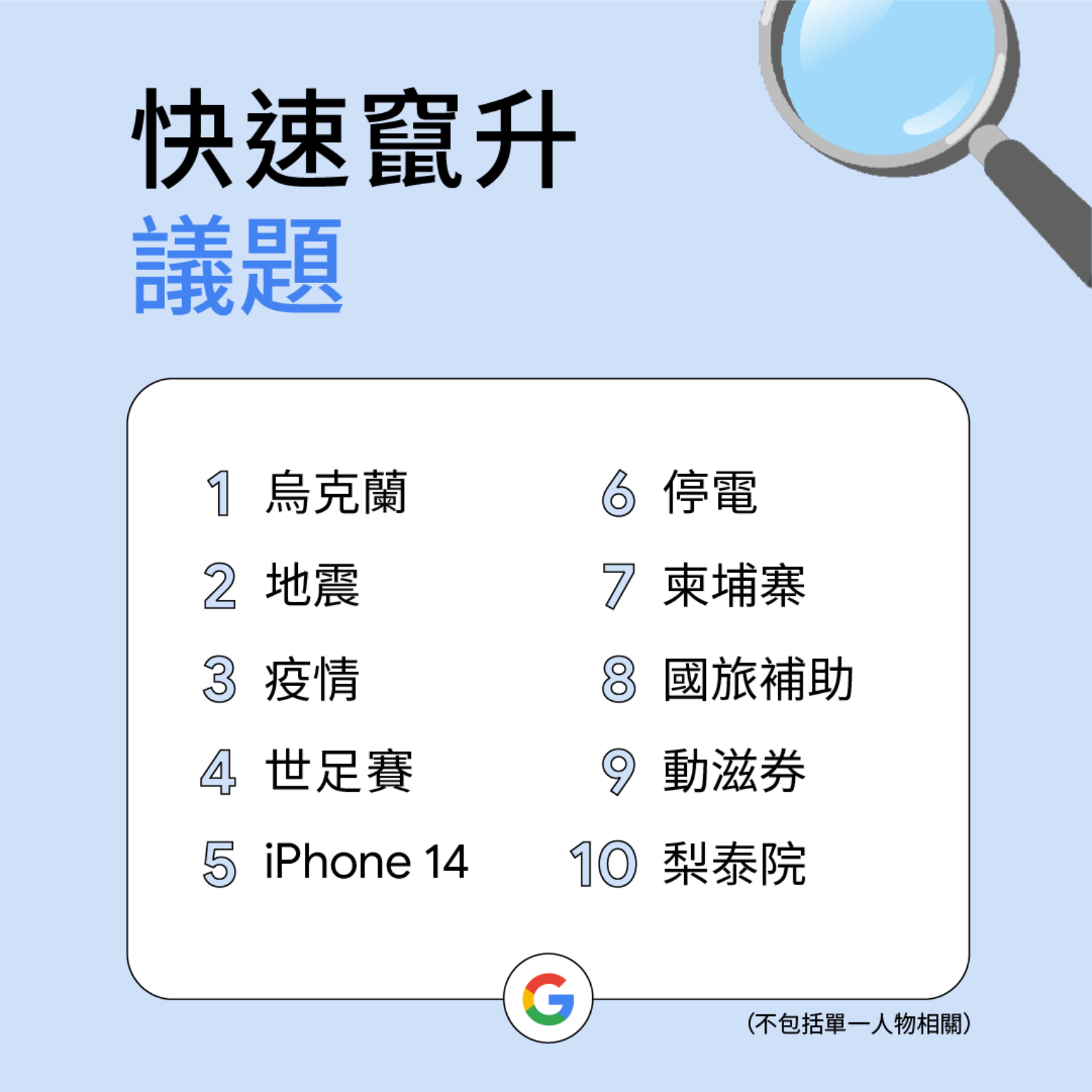 在十大快速竄升議題也可見台灣網友對民生消費、人身安全,與公安意外的關心。排名第五名為每次發布總會引起討論的蘋果新機「iphone 14」、第六名是3月3日發生的全台大「停電」,不只全台549萬戶受影響,當時交通也大打結。