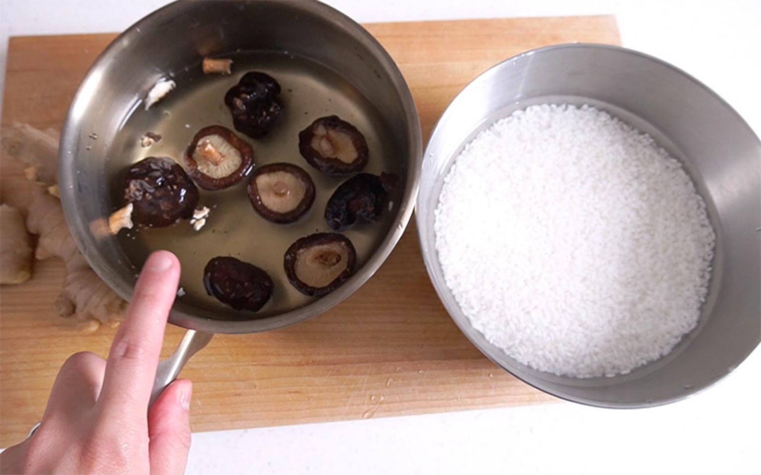 事前準備很重要,乾香菇與白米飯泡水30分鐘。
