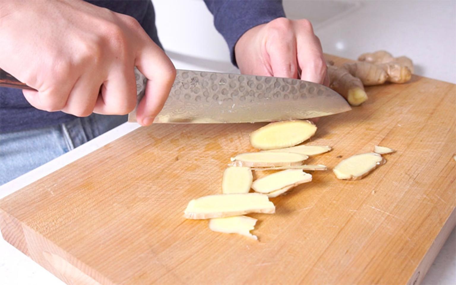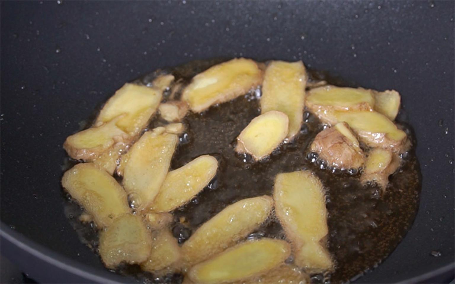 取炒鍋,中小火熱鍋,加入麻油,先下薑片煸香。