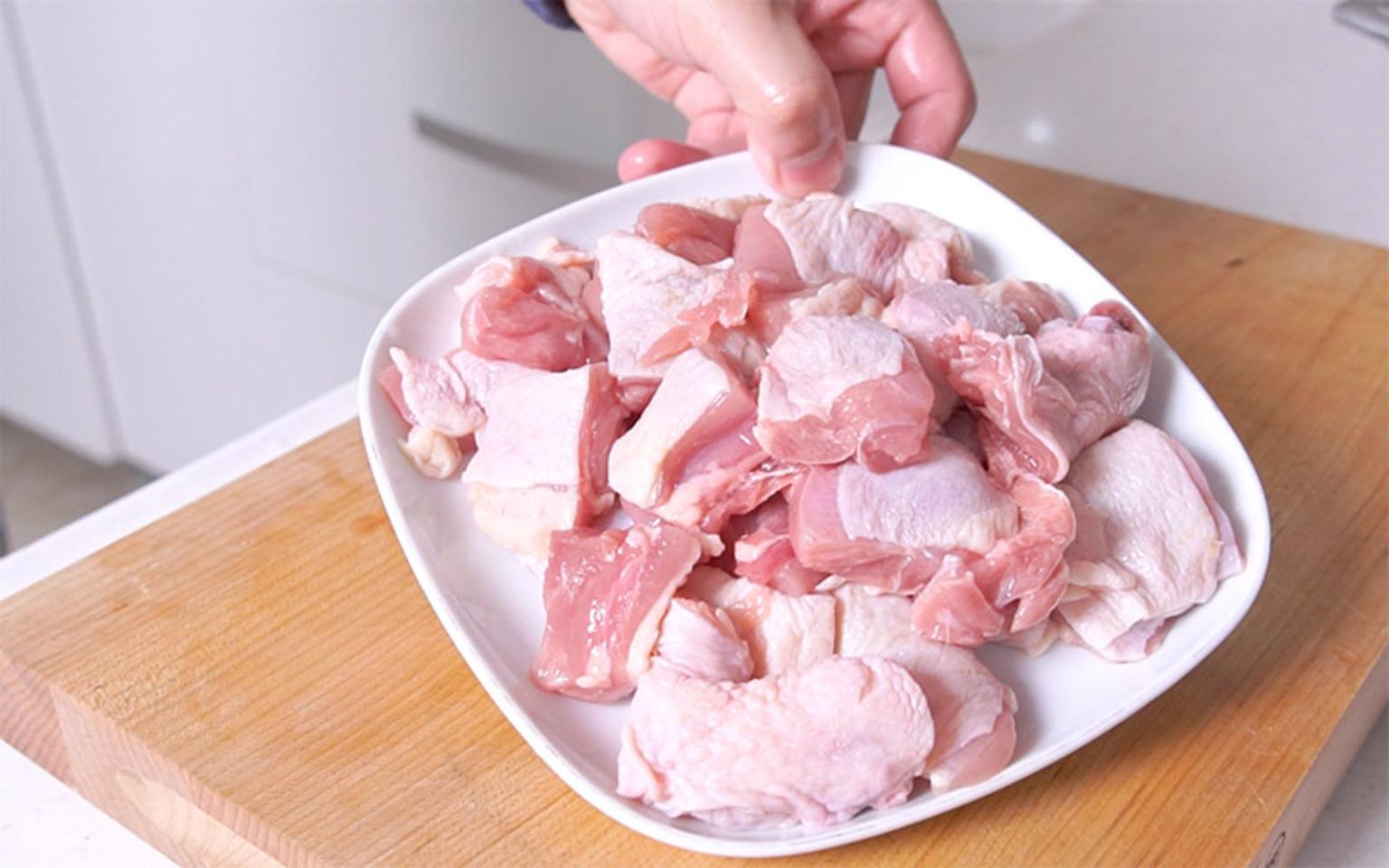 一樣維持中小火慢炒,持續翻炒直到雞肉略微焦黃上色。
