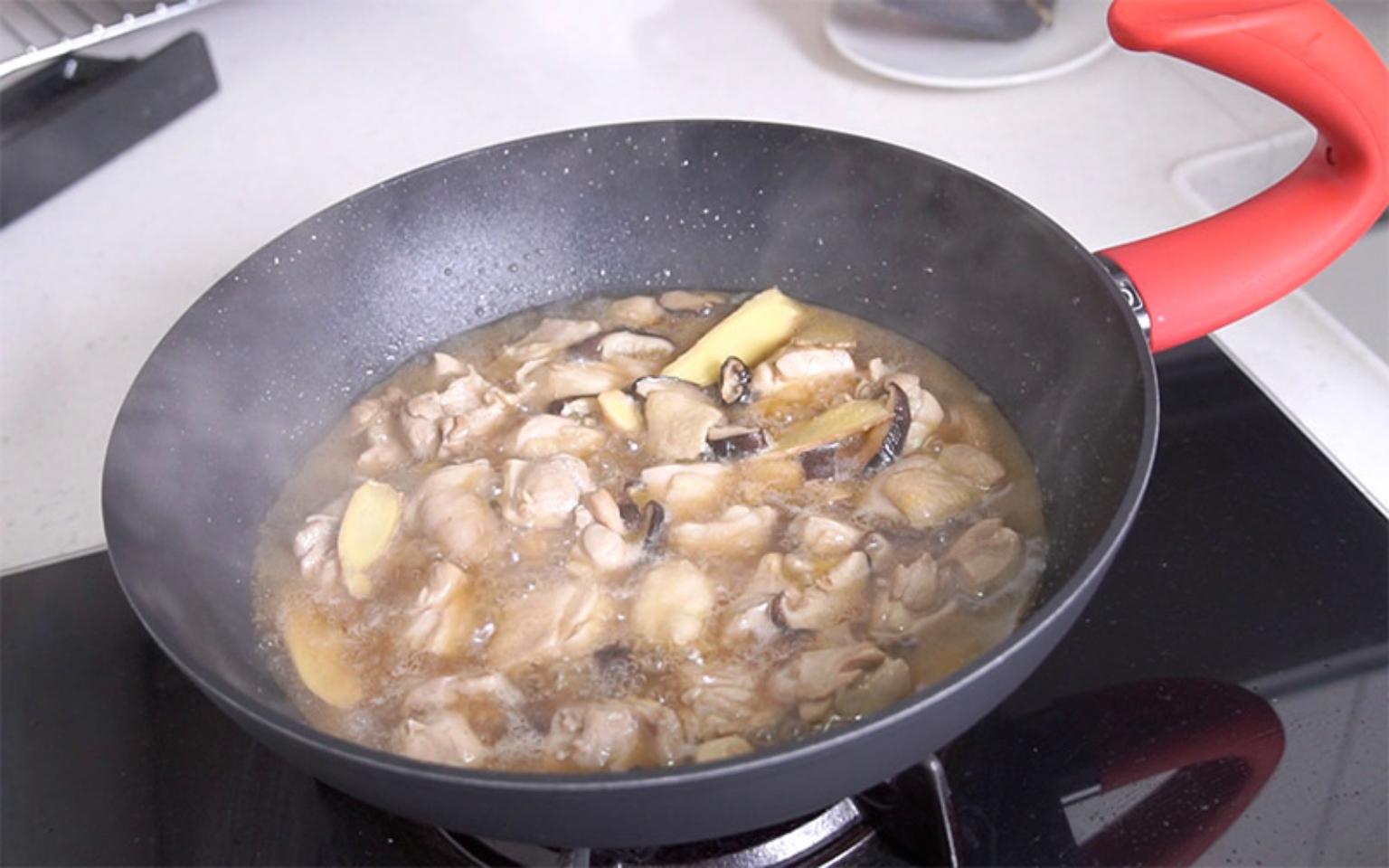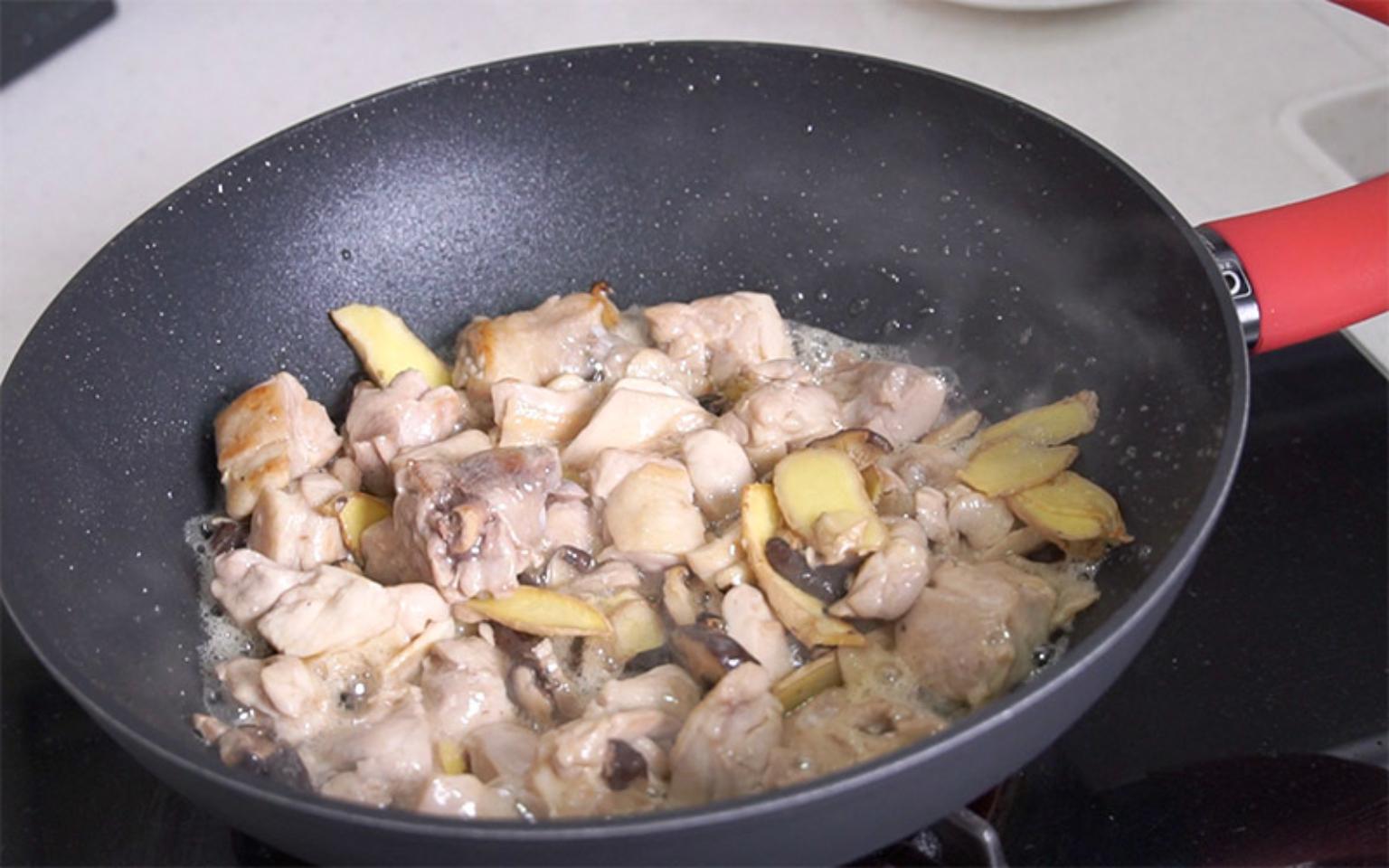 煸出薑香後,加入雞肉香菇持續炒上色。