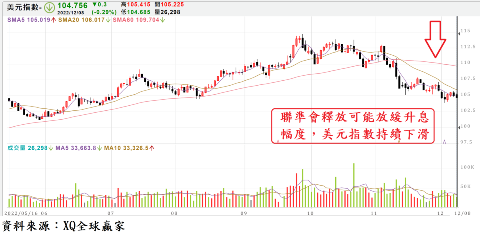 聯準會釋放可能放緩升息幅度,導致美元指數持續下滑