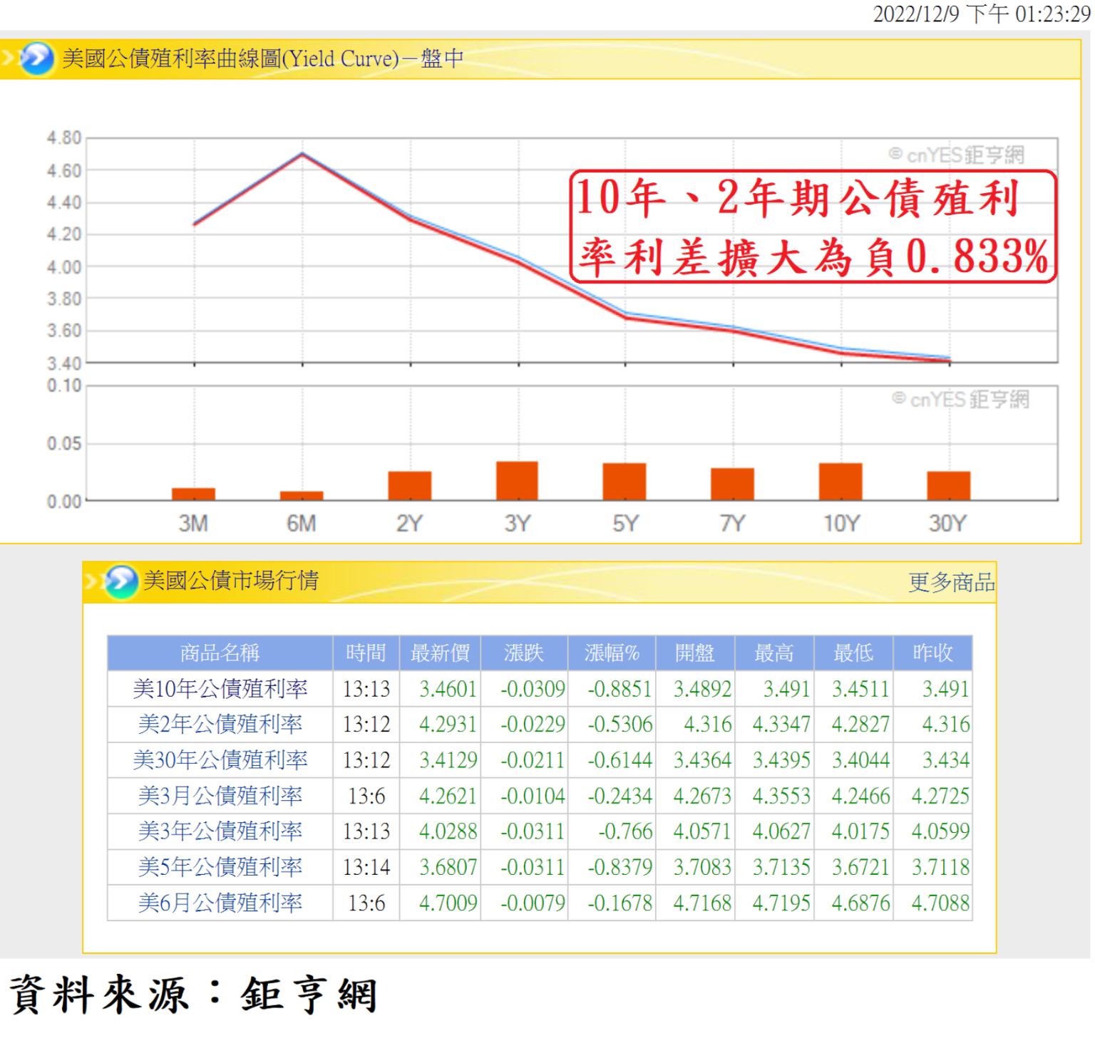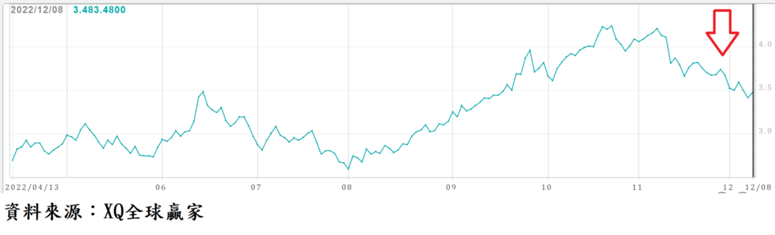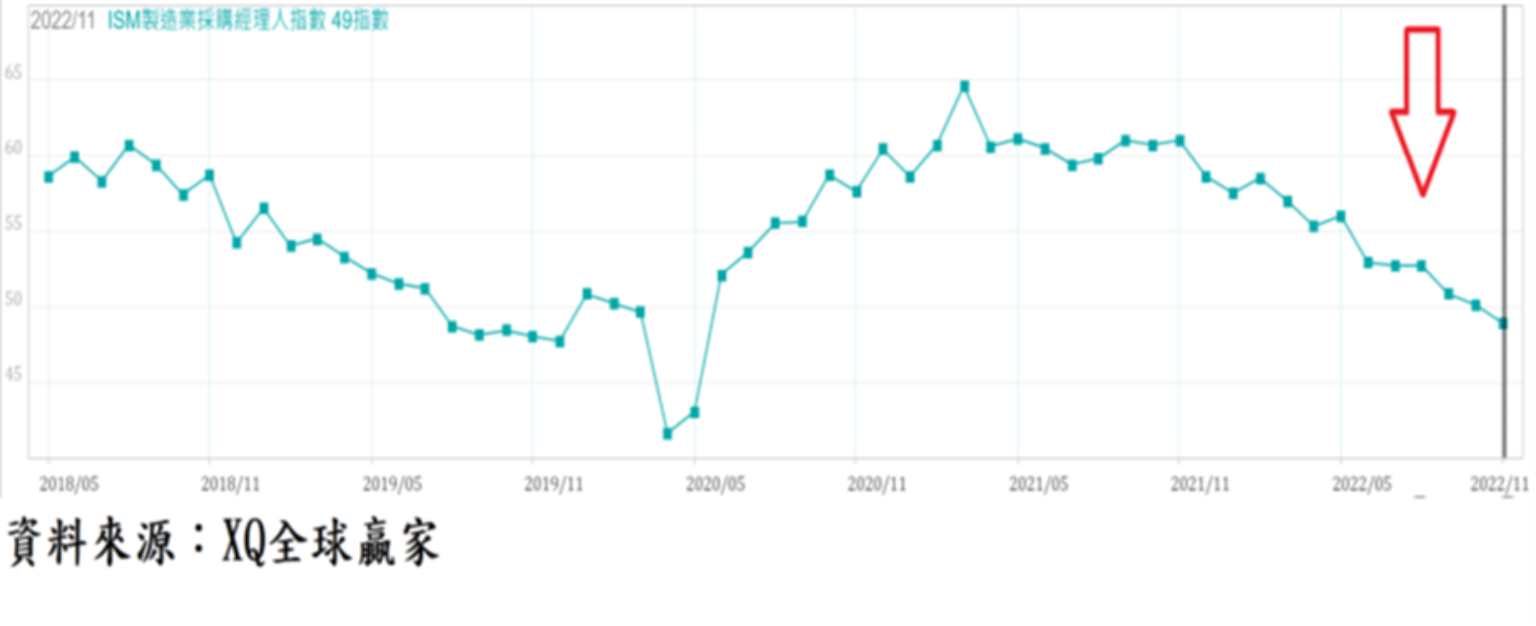 美國11月ISM製造業採購經理人指數自10月的50.2下降至49.0,低於市場預期的49.8、跌落景氣擴張與收縮的50臨界點、續創2020年5月後最低點,顯見美國製造業景氣自第二季以來的趨緩態勢越來越明顯,且在第四季進入製造業景氣收縮狀態,讓市場燃起美國聯準會猛爆式鷹派貨幣政策可能在12月開始趨緩的期待,市場預期12月的Fed利率決策會議將從調升聯邦基金利率三碼縮小為兩碼。