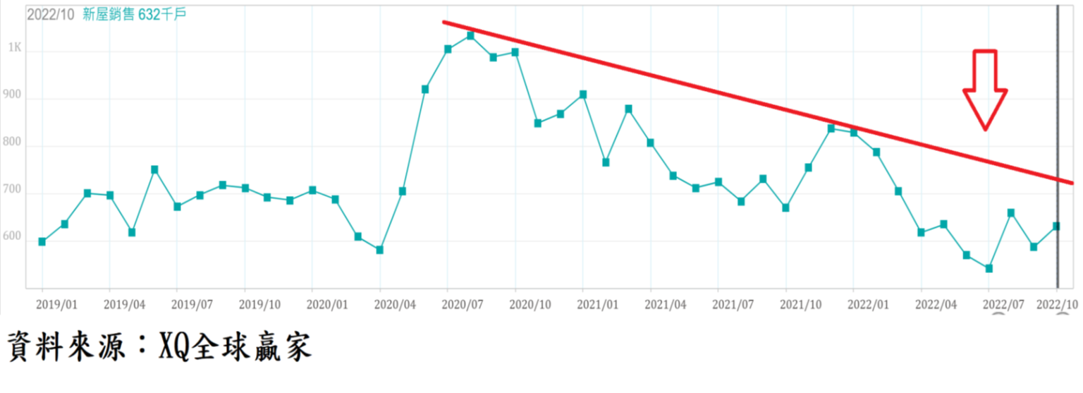 美國10月新屋年率銷售戶數上升至63.2萬戶,月增7.48%,較去年同期年減5.81%,連續8個月較去年同期衰退,顯示疫情期間推高的銷售高峰在2020年8月的103.6萬戶,隨後震盪走低,並隨房價走高及疫情舒緩導致居家辦公需求降低,單月新屋銷售戶數雖已經3個月未續創2020年8月後最低點,但下降趨勢仍未轉向。