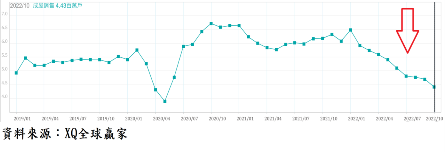 美國10月成屋年率銷售戶數下降至443萬戶,月減5.94%,較去年同期年減28.43%,連續13個月較去年同期衰退,顯示疫情期間推高的銷售高峰在2020年10月的673萬戶,隨後震盪走低,並隨房價走高及疫情舒緩導致居家辦公需求降低,新屋銷售戶數下降趨勢仍未轉向。