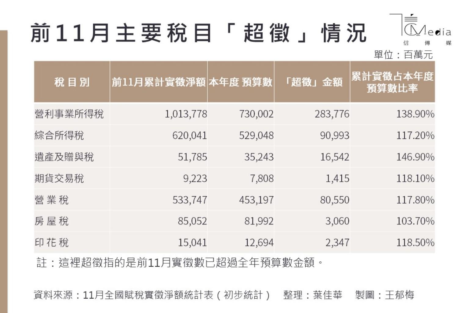 攤開今年前11月的全國賦稅實徵淨額統計,其中,包括營利事業所得稅、綜合所得稅、遺產及贈與稅、期貨交易稅、營業稅、印花稅等稅目,目前實徵到的稅額已經超過全年的預算額,也就是達到超徵的情況。其中,營所稅及綜所稅分別超徵約2837億元、約910億元;營業稅也同樣超徵約805億元;不過,貨物稅、證交稅、土增稅、菸酒稅至今仍是「短徵」。