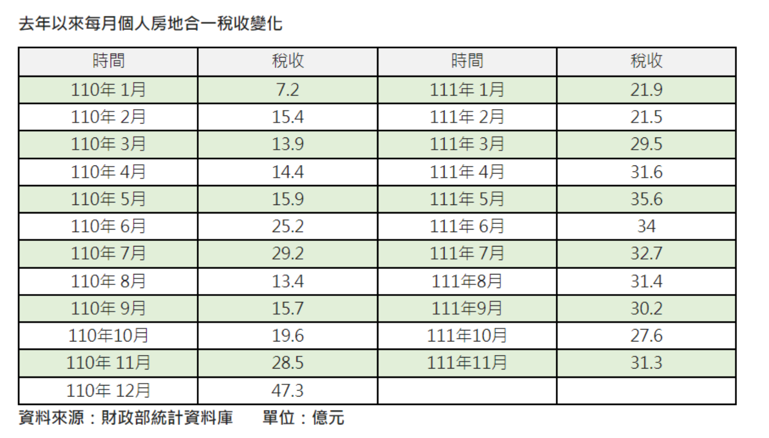 財政部統計顯示,今年11月個人房地合一稅收為31.3億元,年增約1成,不過今年稅收高峰落在5月的35.6億元,11月的個人房地合一稅收則擺脫連續5個月的下跌趨勢,回升到31.3億元。