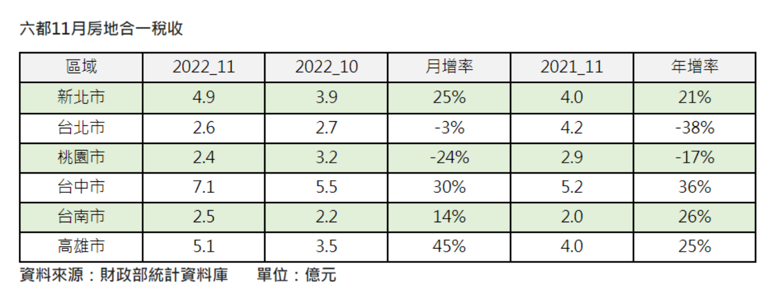 比較11月六都個人房地合一稅收,稅收最高的仍是台中市的7.1億元,月增幅達3成,其次則是高雄市5.1億元,月增45%,新北市4.9億元,月增25%,台南市為2.5億元,月增14%,南台灣的房地合一稅收11月都呈現月增。