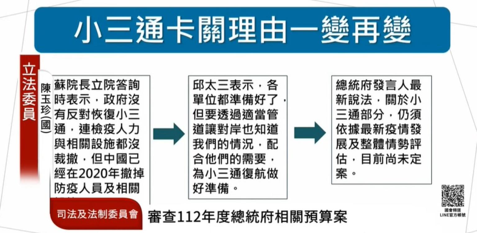陳玉珍追問,關於是否能開放小三通,政府迄今出現3種不同版本的說法,究竟疫情整體評估開放指標為何?李大維再度重複稱:「會依賴其他機關報告。」