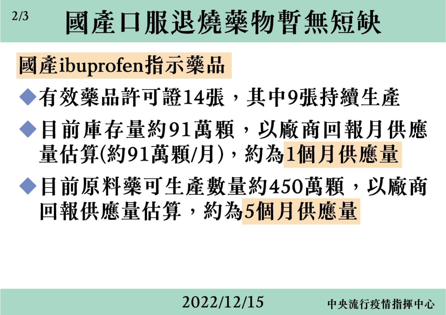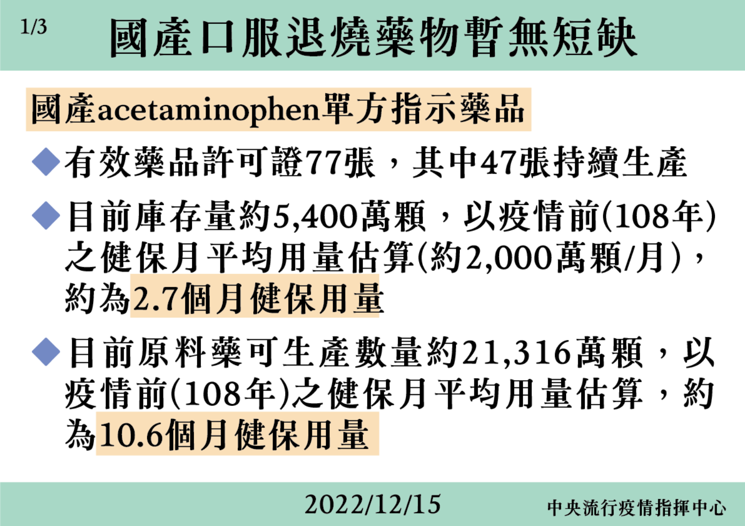 而目前原料藥可生產數量約21,316萬顆,推估仍有10.6個月健保用量,目前看起來藥物仍然充足。指揮中心表示,國產口服退燒物暫無短缺,臨床端尚有其他種類處方藥品可供退燒使用。