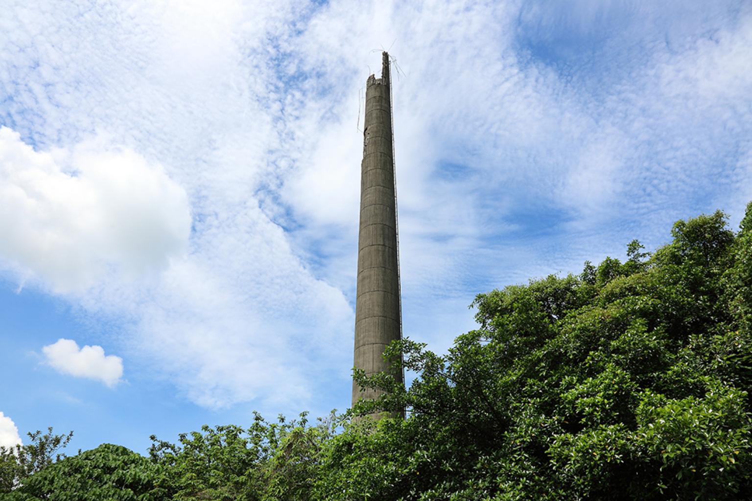 走訪鄰近忠義派出所的共益磚窯廠,在蓊鬱綠意籠罩下,隱約露出由紅磚砌成的八卦窯。民國38年蕭家買下日治時代窯場,開始生產紅磚,早期為傳統的目仔窯,後來產量增加,遂改建為八卦窯,並在窯體中心矗立起高聳的大煙筒。「共益窯最特別的是有兩座煙囪,由於中央的主煙囪被颱風吹倒,蕭家後來在旁邊蓋了新煙囪,利用地底通道連結排煙。」李繼強說。抬頭仰望深入天際的筆直煙囪,50公尺的高度看起來格外壯觀。李繼強補充道:「早期窯廠都是燒煤炭,煤灰常會飄到鄰近住家弄髒陽台衣物,經居民屢次抗議,煙囪越蓋越高,變成現在的模樣。」