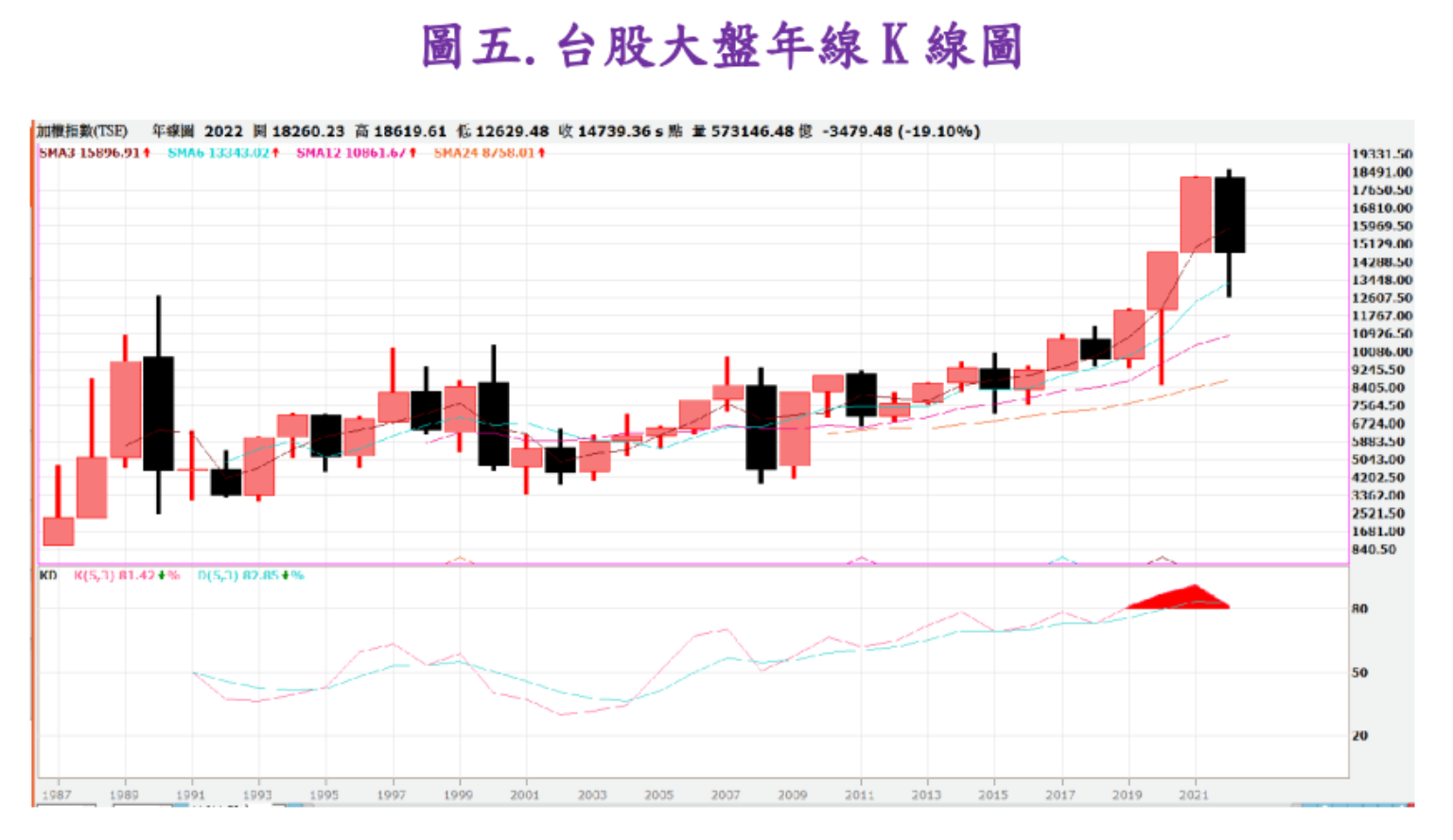 另外,從民國75年來台股大盤指數沒有出現連續兩年收黑的情況來說,見下圖五所示,2022年台股大盤會收黑,2023年全球政經環境及企業獲利會比2022年更差,未來台股大盤低點可能會比2022年低點還低,如果2022年12月台股大盤指數還非常高,恐怕2023年底很難超越。12月台股大盤指數若是大跌騰出空間,較有可能讓2023年底指數略微高過2022年底指數,符合沒有連續兩年空頭走勢!如果2022年12月底台股收盤指數還在很高位置,不是2023年第四季底要更用力護盤,不然就是2023年台股大盤收盤指數低於2022年12月底收盤指數,台股大盤年線收盤第一次出現連續兩年收黑的情況。