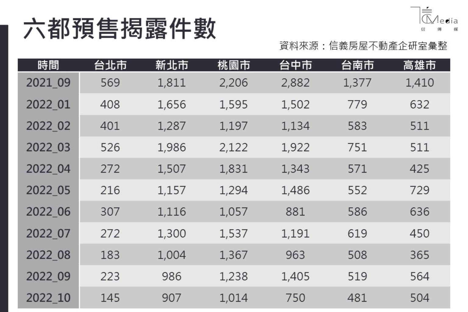 北部區域的新北市與桃園市也都同步衰退,新北市10月揭露907件,桃園市10月揭露1014件,兩者較去年旺季9月衰退約5成,但已經是幅度相對較小的區域,其餘四都較去年9月景氣高點減少6~7成。
