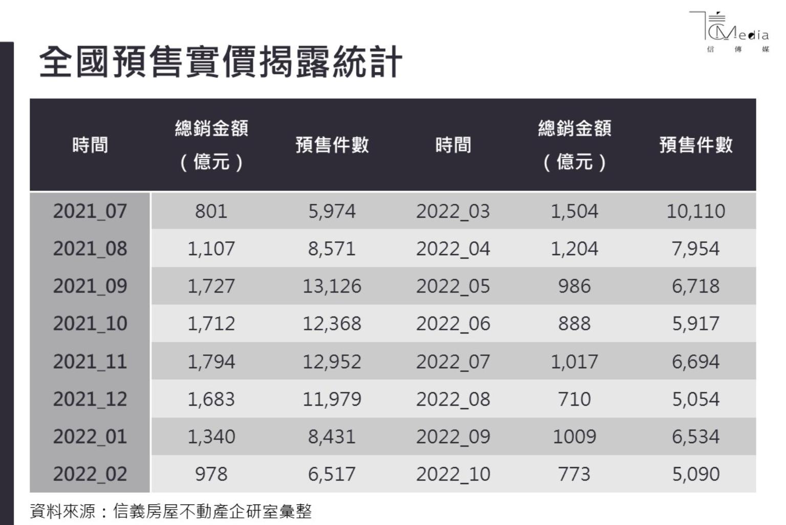 信義房屋統計官方預售實價揭露件數資料,2021年9到12月房市景氣高峰時,平均單月預售揭露的件數可達1.2萬件,單月揭露的總銷售金額可達1700餘億元,不過今年下半年房市吹冷風,從5月起連續半年的預售揭件數都跌破7000件,較去年旺季腰斬,一手市場向來是房市領頭羊,一手市場降溫也反映房市進入盤整期。