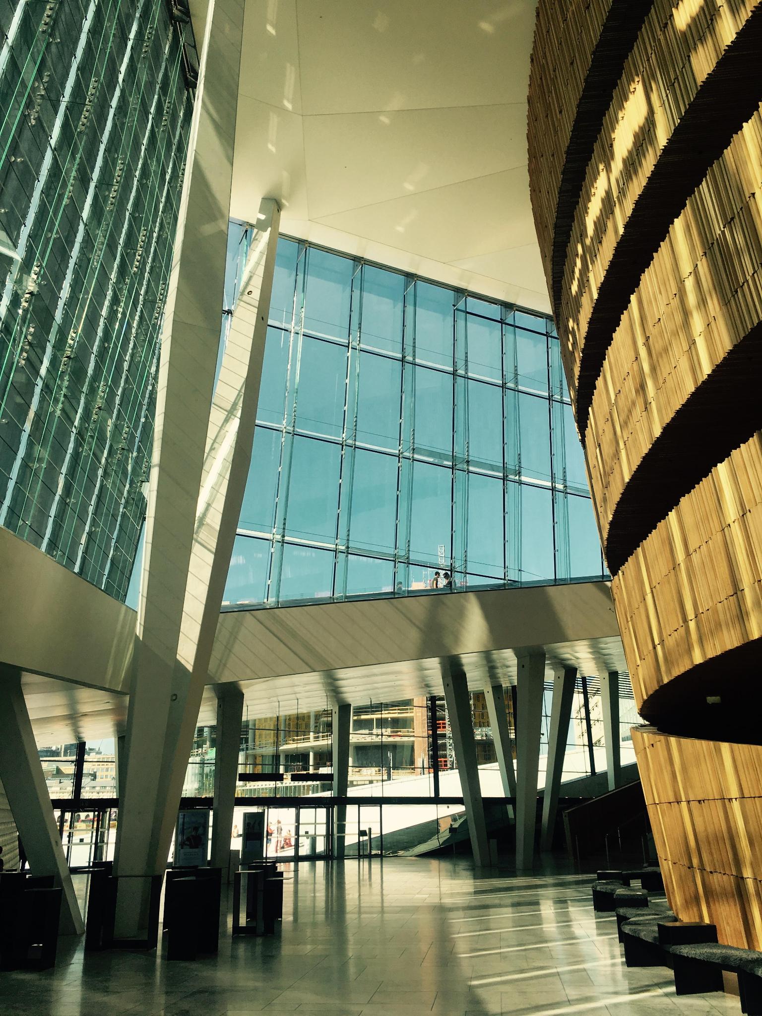 一踏進奧斯陸歌劇院室內,在眼前展開的是以白色大理石所鋪設的入口大廳,牆面如同冰山般漂亮的漸層色彩與造型散發著凜冽的魅力。空間全體以白色大理石、橡木及自然光點綴,自然光從猶如冰山裂縫般的玻璃開口處射進來,大理石將那光加以反射,空間全體變得明亮柔和而令人深感舒適。帶有劇場機能的部分則以木材牆面所覆蓋,在外部自然光的照射下創造出優雅的陰影。