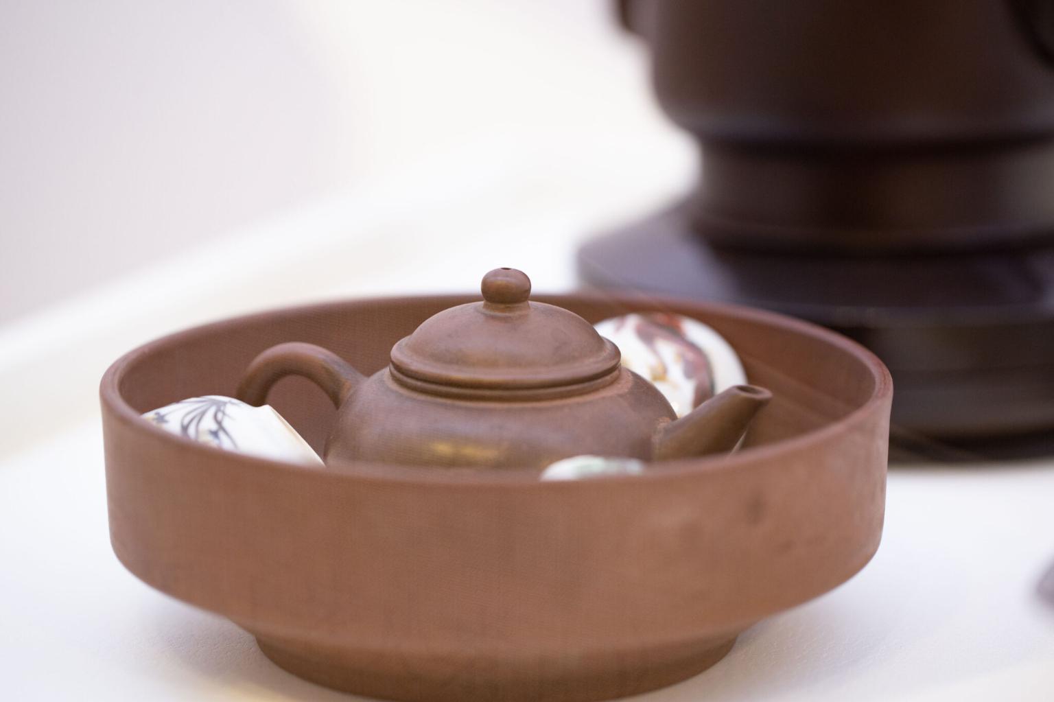 水煮好後,備上 1 只茶壺、3 至 4 只薄胎小杯,以及碗狀的「茶船」,就可以開始泡茶。茶船除了用來盛裝茶壺,也可避免泡茶時水流四處。因為在傳統工夫茶泡法中,為了維持茶壺的熱度,讓茶葉較快張開、釋放香氣,會將滾水反覆淋在茶壺表面預熱。喝茶時採取「小杯多巡」的方式,茶葉可以沖泡多次,利用小杯細細品嚐每泡茶的層次變化。
