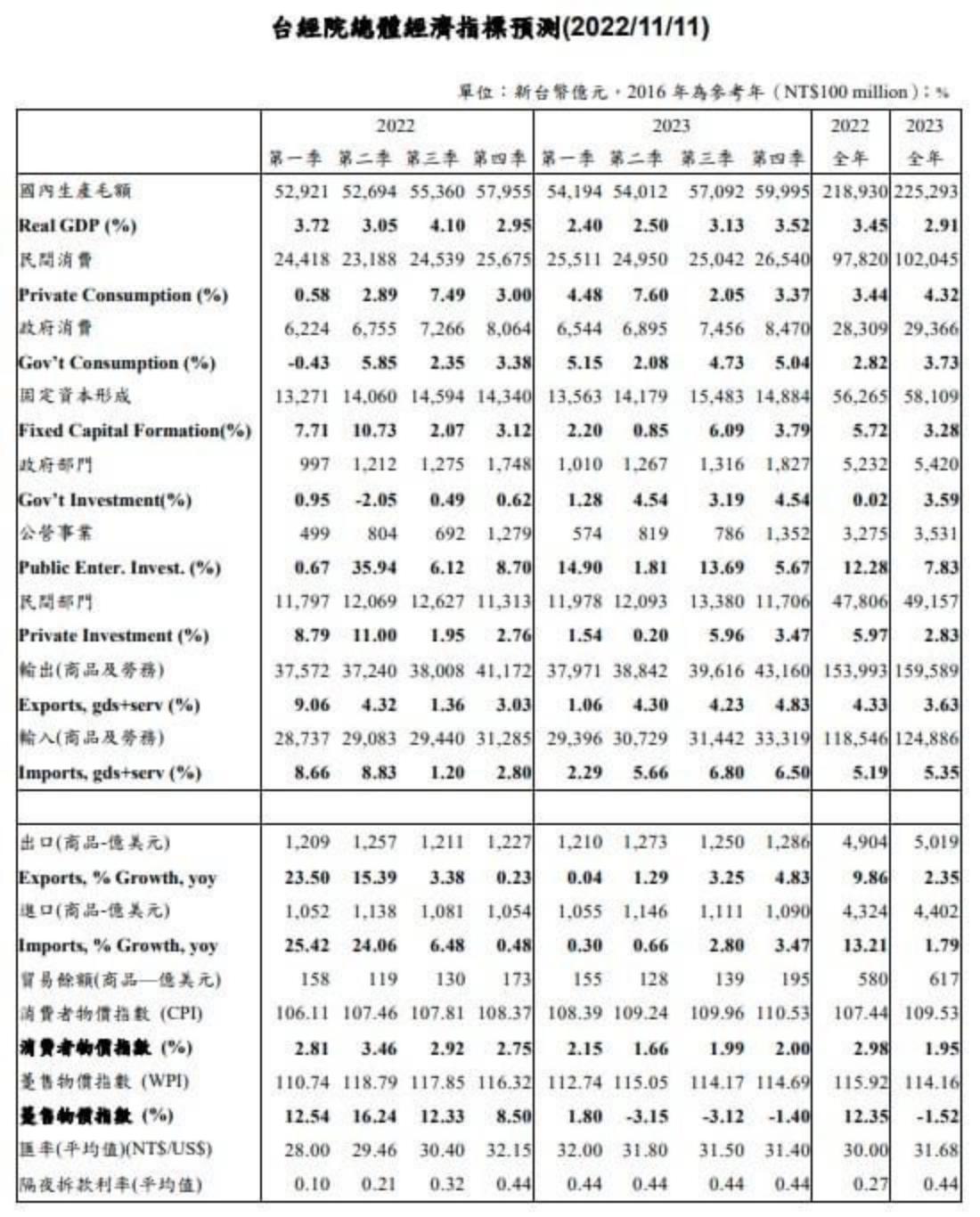 根據台經院於2022年11月公布之最新預測,2023年GDP成長率為2.91%,較2022 年更新後3.45%減少0.54個百分點,其中2023第一季出口幾乎等於持平2022年第一季,市場普遍展望不樂觀。