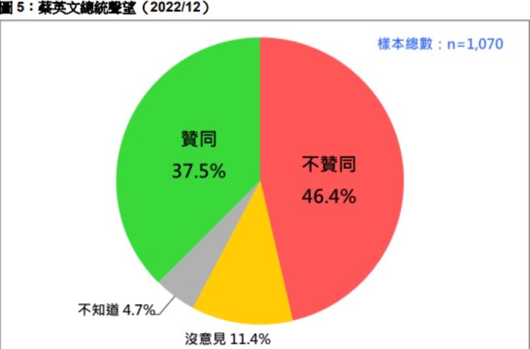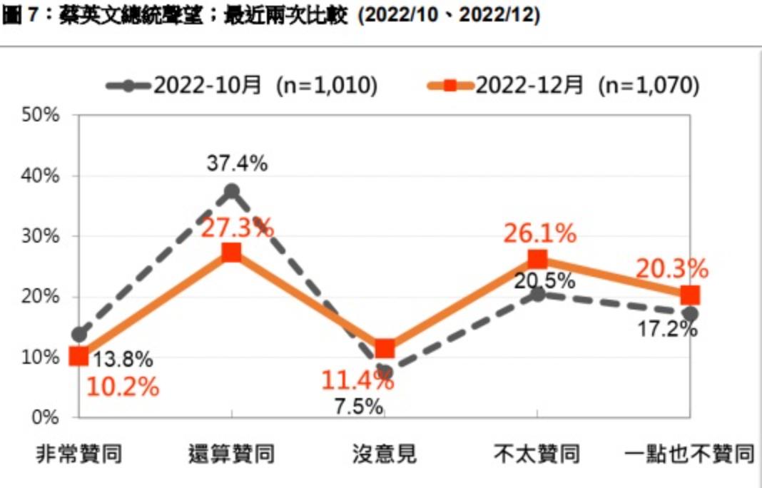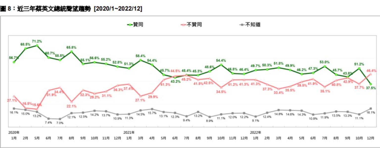 蔡總統聲望大幅滑落,不僅創下2020年1月總統大選以來的新低記錄,更直追2019年1月9合1選舉重創後的低迷時期,也是自2016年5月上任以來,單次聲望跌幅最大的一次。