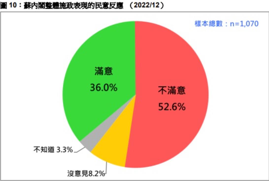 至於對蘇內閣的施政表現,7%非常滿意,29%還算滿意,24.1%不太滿意,28.5%一點也不滿意,11.5%沒意見、不知道、拒答。換句話說,有3成6基本上滿意,有5成3不滿意,不滿意比滿意者多16.6%。