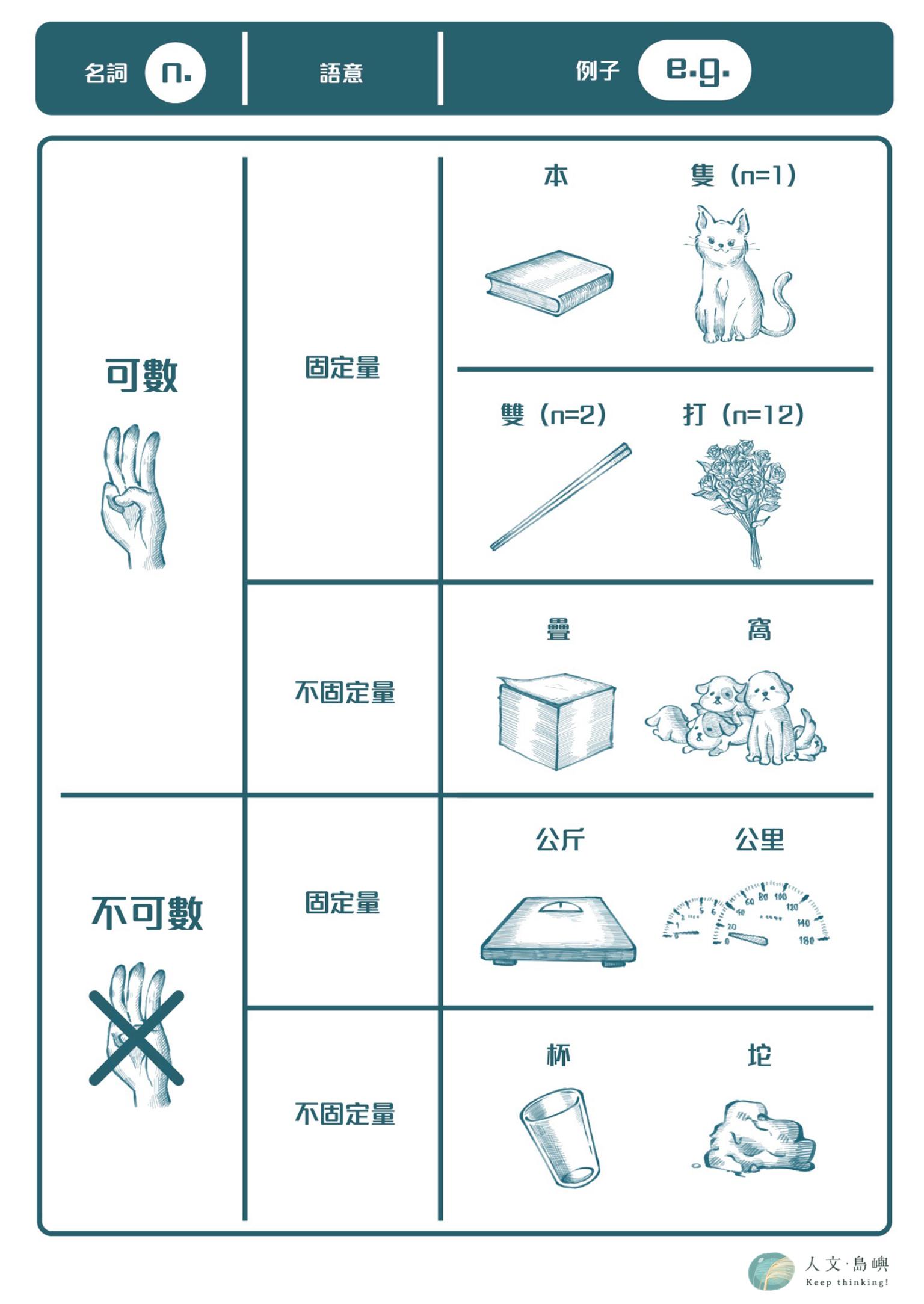 中文使用者不容易區別分類詞和量詞,是因為它們在語法上佔據相同的位置,都在「數詞之後、名詞之前(三___蘋果)」。不僅如此,何萬順更發現它們都能對應到數學的乘法關係,用更簡潔的式子表達:三雙筷子是3 x 2 x筷子,三本書則是3 x 1 x 書。