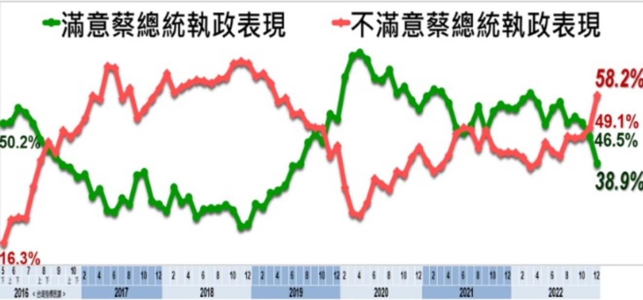 《美麗島電子報》今日公布12月國政民調,總統蔡英文的信任度在9合1選後,比上月陡降6.4%,創下2019年6月以來新低;不信任度反向大增6.3%,達到2019年3月以來的最高點。