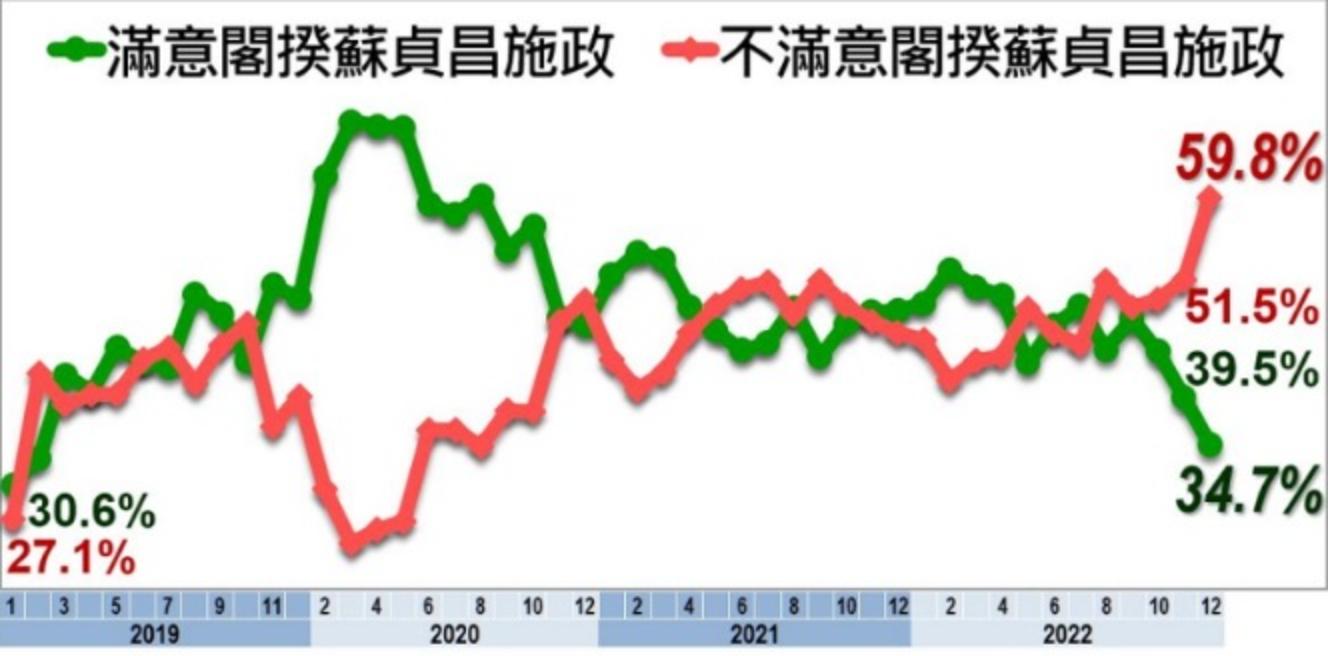 蘇貞昌在12月的施政表現評價震盪幅度,超過13.1%,就連泛綠民眾滿意度也減少8.6%,不滿意大增9%,也讓黨內外總辭呼聲不斷。