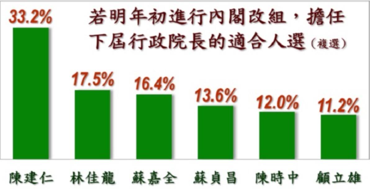如果明年初進行內閣改組,對於適任人選,以前副總統陳建仁33.2%最高,其次依序為林佳龍17.5%、蘇嘉全16.4%、蘇貞昌13.6%、陳時中12.0%、顧立雄11.2%,未明確回答有36.1%。