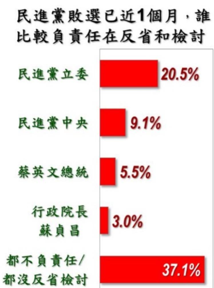 結果有20.5%認為是民進黨立委、民進黨中央9.1%、蔡英文5.5%、蘇貞昌只有3%,甚至37.1%認為,都不負責任或都沒反省檢討,未明確回答有24.8%。