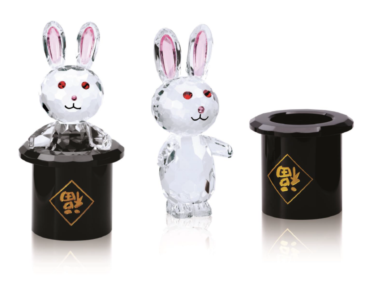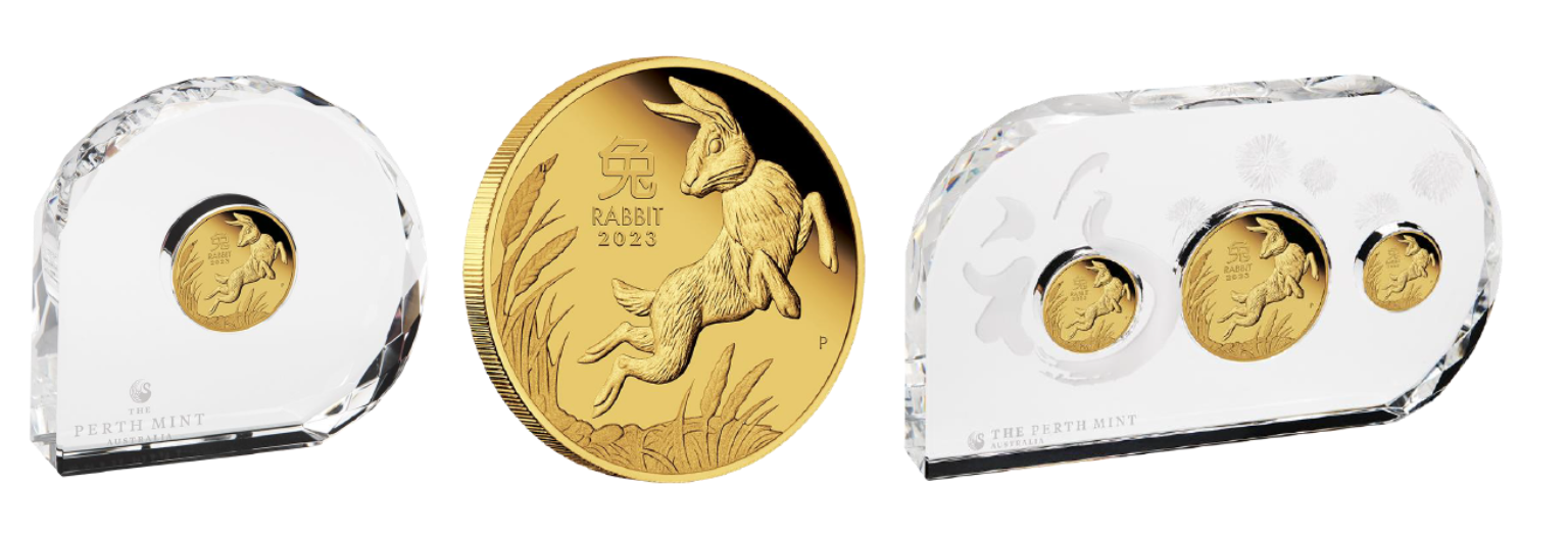 幣面刻鑄一隻毛澤光亮,矯健靈動的金兔,在山野群草間奔跑,繼而長耳豎 起,回首彈跳躍起。寓意事業、財運飛躍高升,鴻圖大展的祥瑞吉兆。本套兔年金幣全套(包含1、1/4及1/10英兩金幣各1枚)售價新臺幣(以下同)142,880元,全球發行量1,500套。客戶亦可購買單枚1/10英兩金幣含水晶座包裝,每枚售價12,880元。