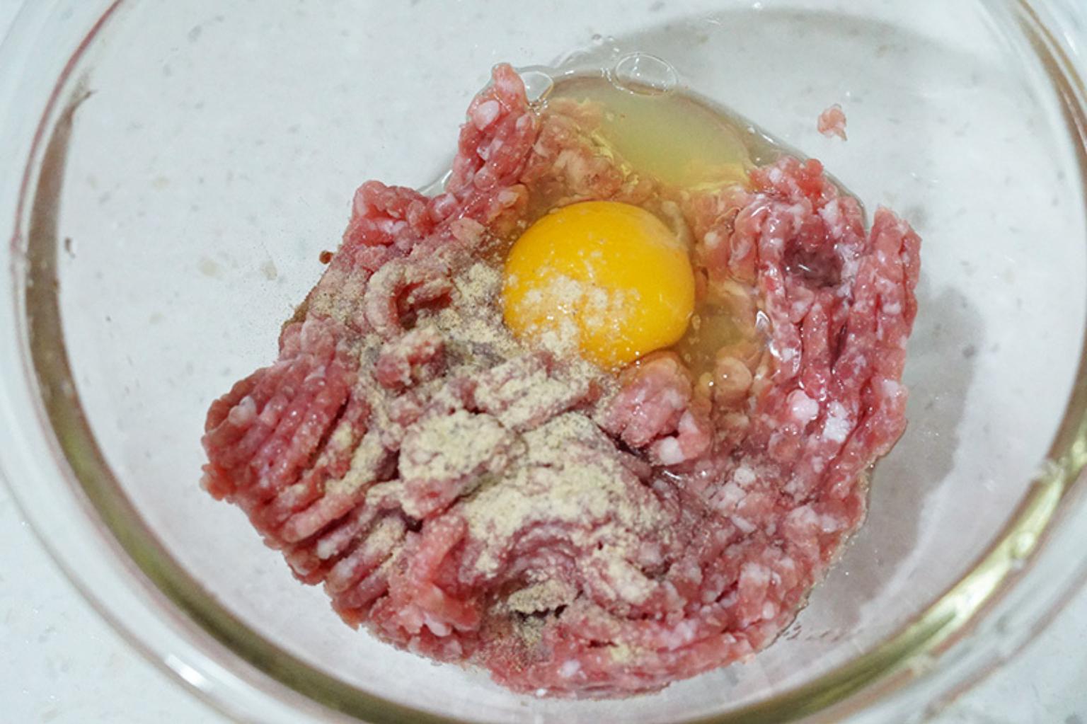 取一大碗,放入豬絞肉、雞蛋、鹽巴跟白胡椒調味。