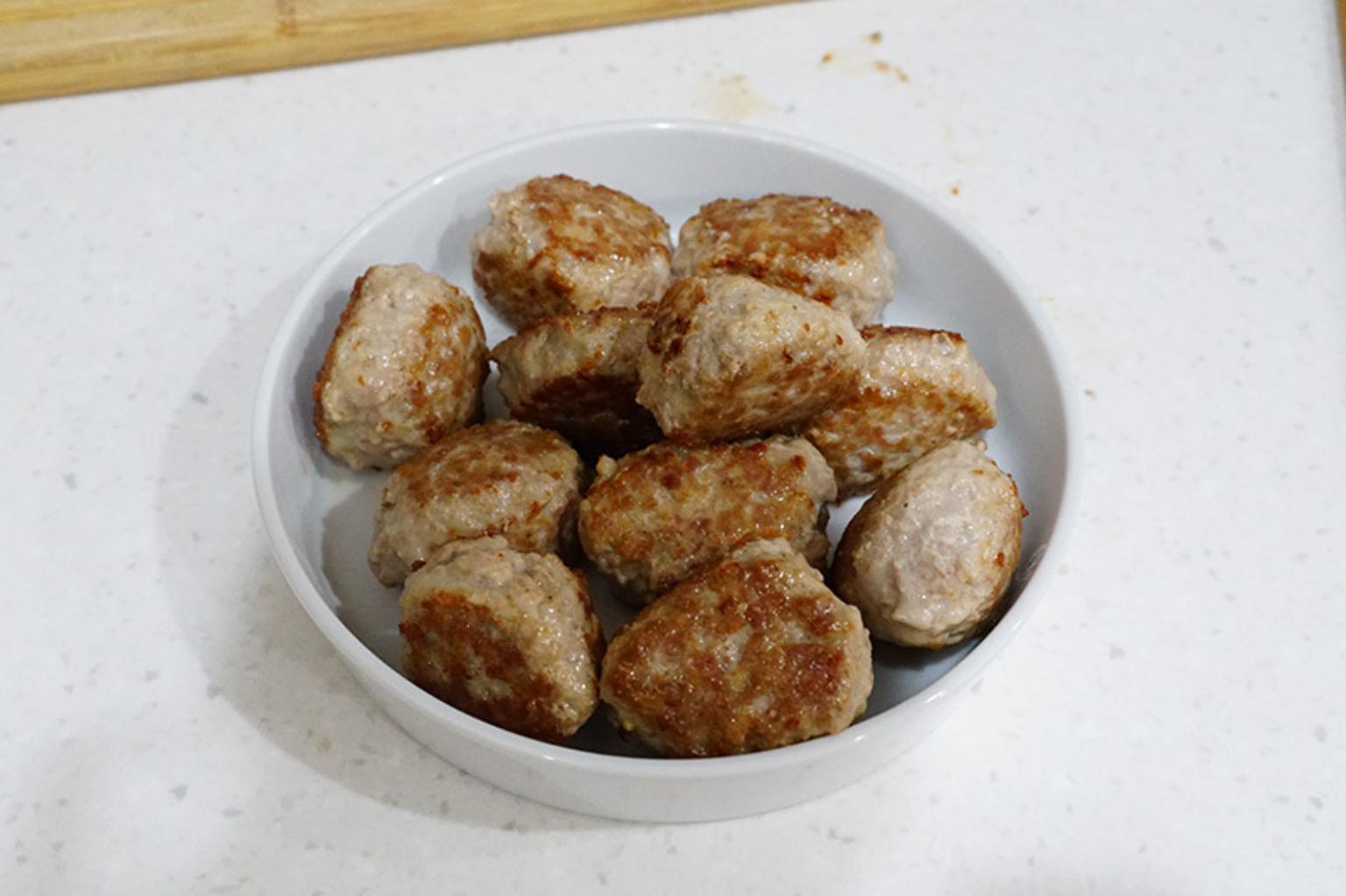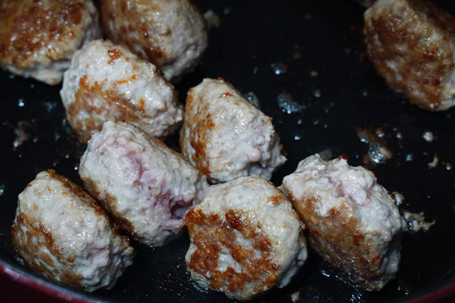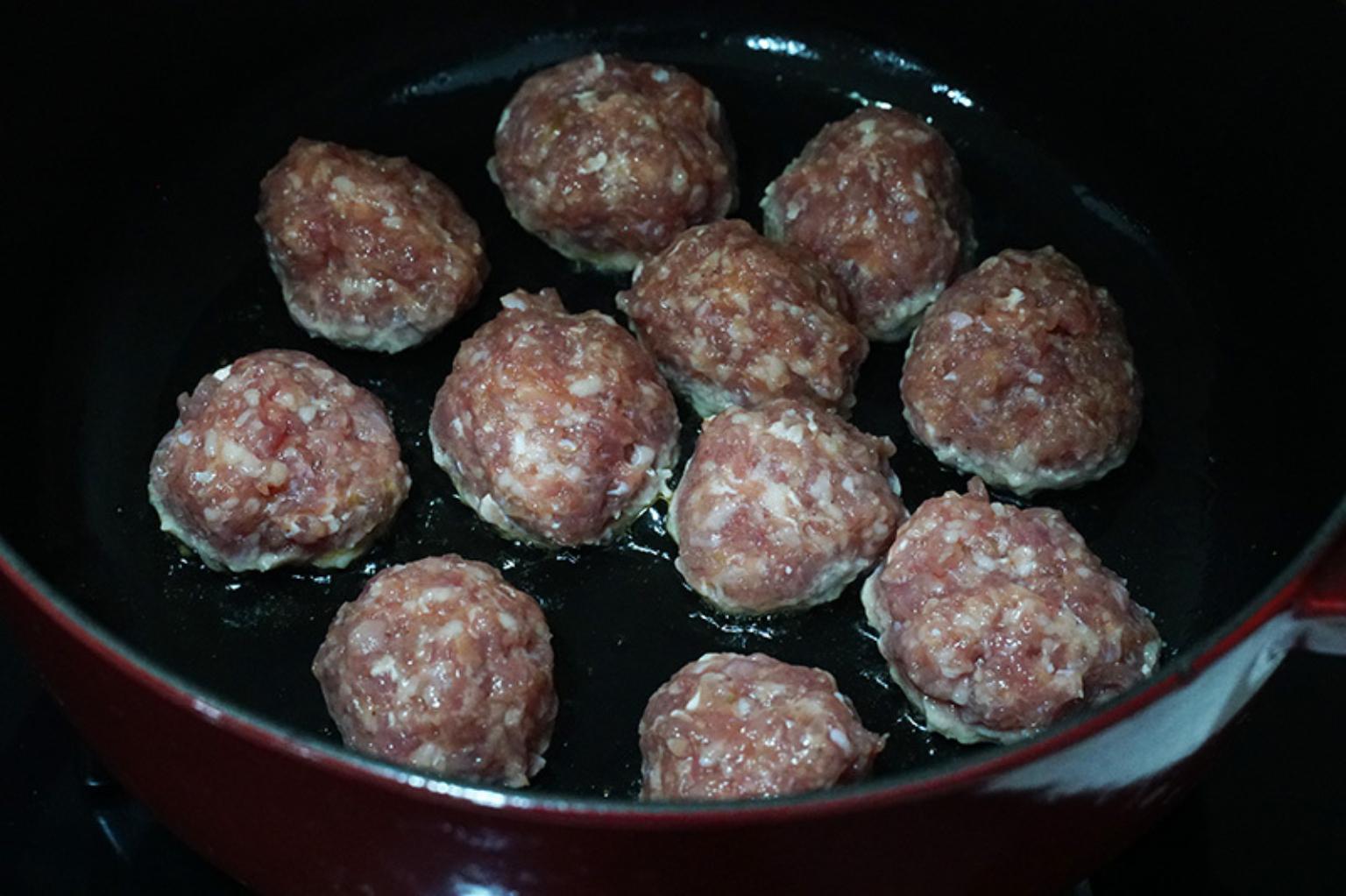 取一湯鍋,充分熱鍋後下肉丸子煎熟。