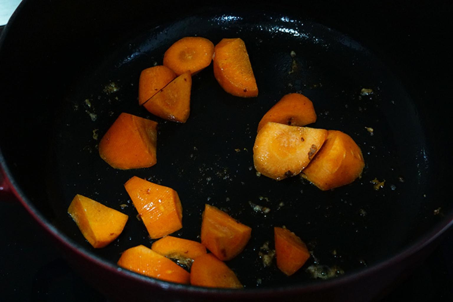 肉丸子起鍋後,千萬不要洗鍋子,也不用再加油,直接將胡蘿蔔下鍋拌炒。