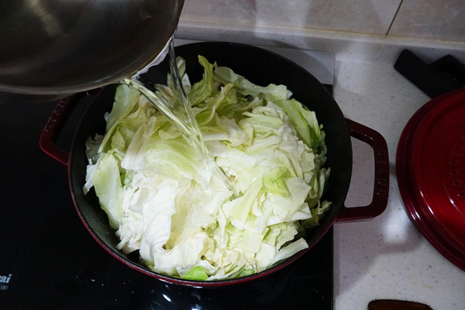 胡蘿蔔稍微炒香後,放入高麗菜,加入水約800c.c.。這邊要注意不要加太多水,不用蓋過食材。因為高麗菜燉煮過程都還會再出水,如果這時候加水太多,到時候就會變成湯了。
