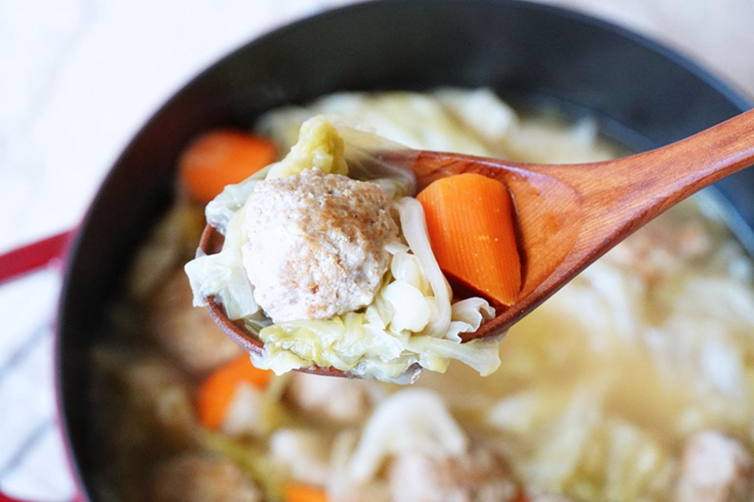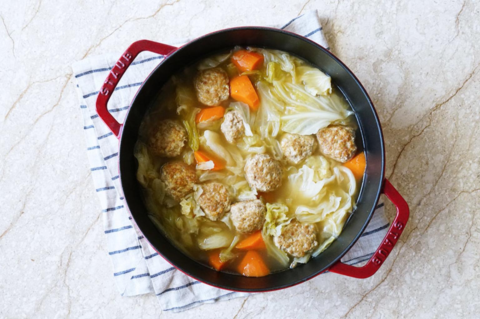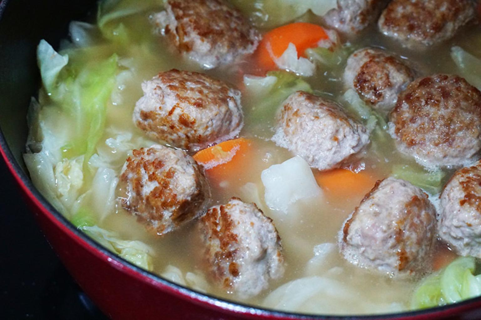 高麗菜煮爛後,再放入肉丸子,加入2湯匙醬油調味。攪拌均勻後,再蓋鍋小火悶燉20分鐘,開鍋就完成啦!