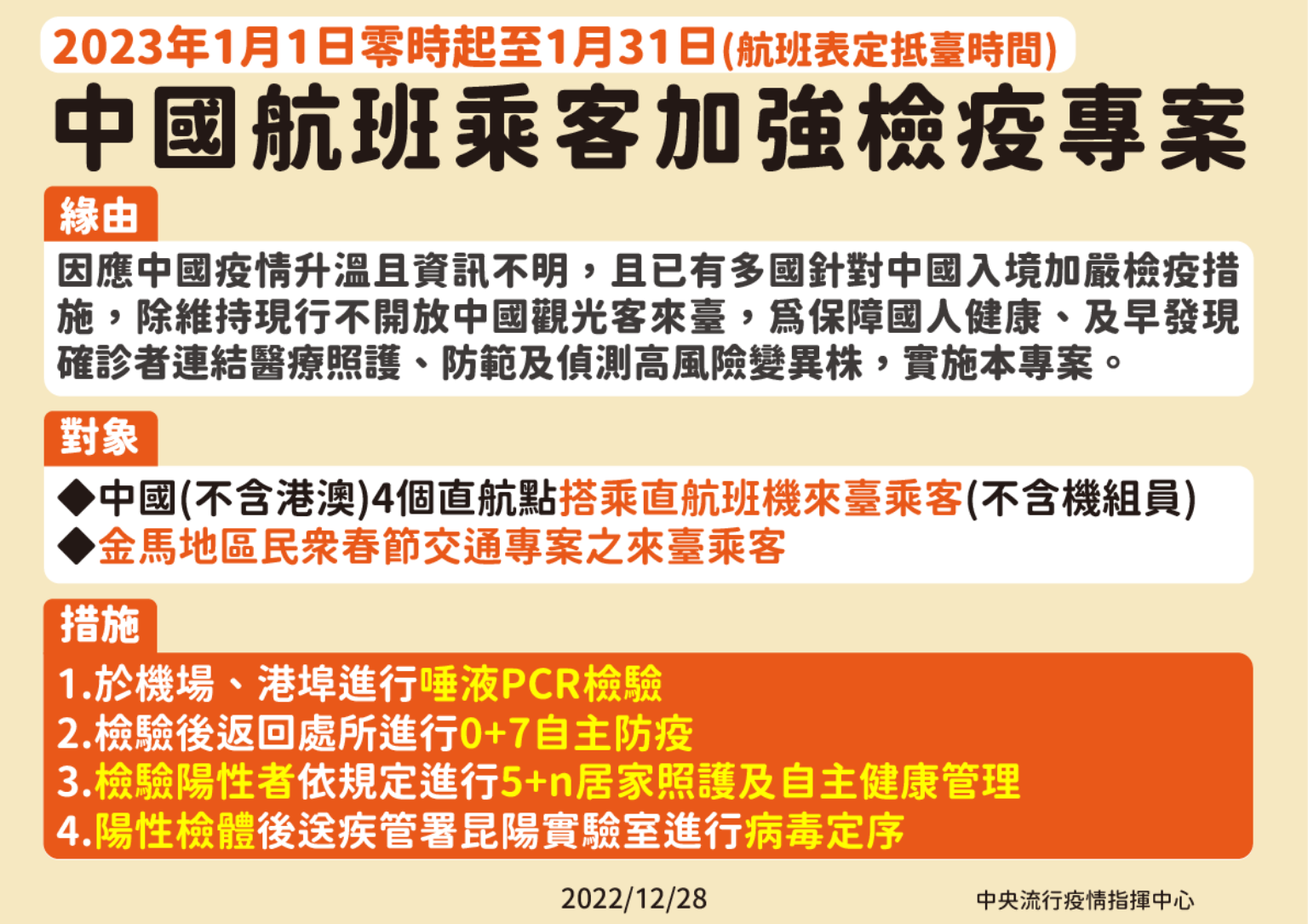 不過訪完柯紹華後,行政院長蘇貞昌拍板,對自中國大陸入境的旅客採檢。下午3點30時,指揮中心也正式宣布,因應中國疫情升溫,自2023年1月1日零時至1月31日(航班表定抵台時間),除維持現行不開放中國觀光客來台之政策外,搭乘自中國4個直航航線,及金馬地區民眾春節交通專案之來台旅客,入境時須於機場(或港口)配合採集唾液檢體進行PCR檢測。