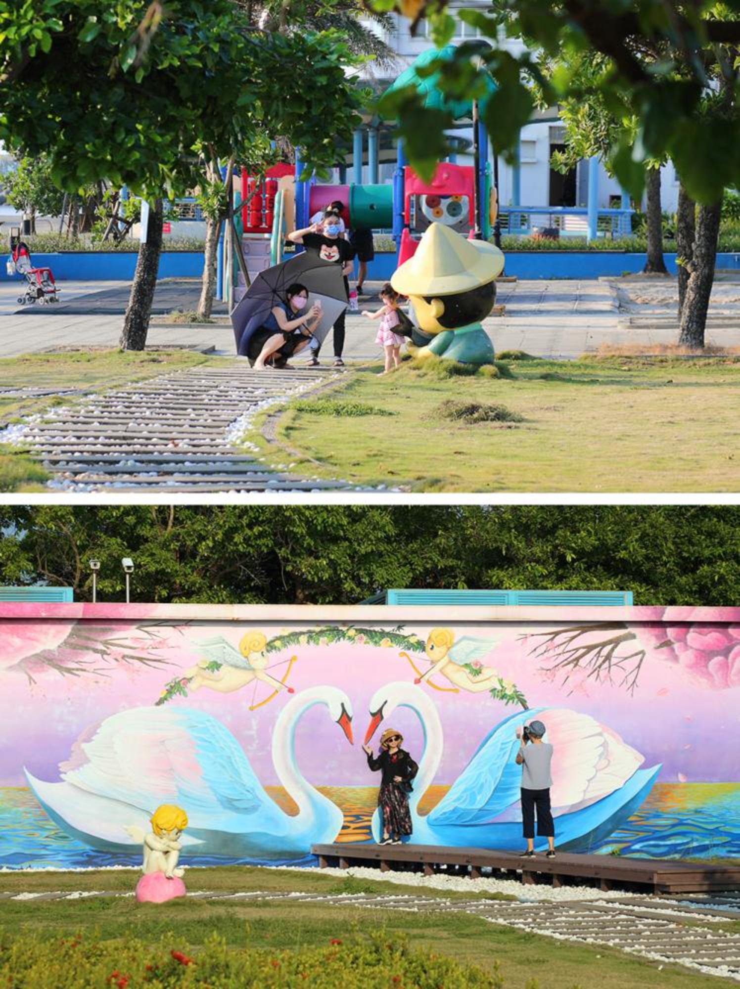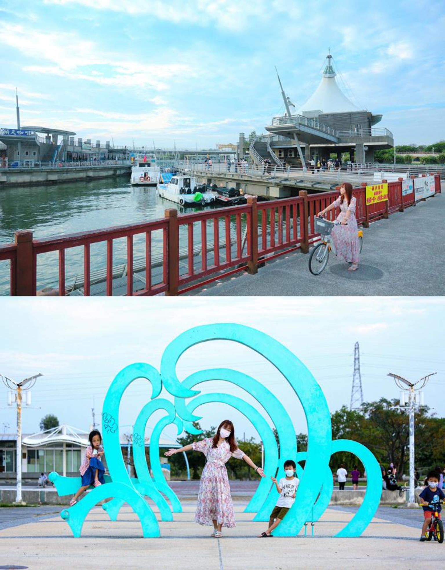 觀光魚市內有煮小卷、炸海鮮等小吃攤,興達港最具代表性的烏魚子做成炸物、燒烤等,價錢實惠鮮度十足。先飽餐一頓再出發,從矗立著兩座白色尖塔的情人碼頭往南騎行,途中有許多大型裝置藝術,讓遊客以海景和藍天為背景,留下美拍回憶。