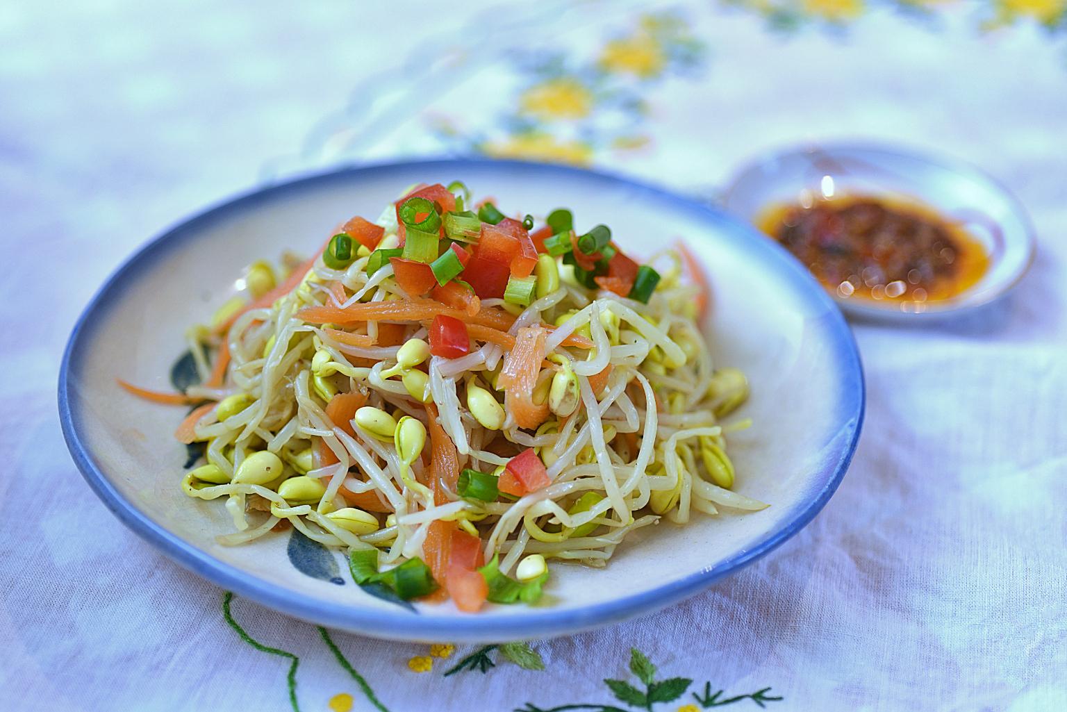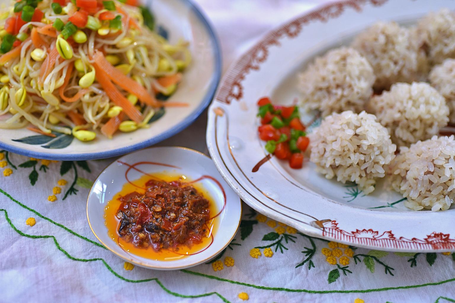 仔細一瞧,發現錦春姊的涼拌黃豆芽還特別挑掉根鬚,她笑說,這是從眷村將官夫人那兒學來的講究,「她們會聚集在村裡的大榕樹下,一邊聊天,一邊把豆芽菜掐頭去尾,綠豆芽就變身銀芽,很漂亮。」窮則變,變則通,就有限的食材下,變化出生活的小確幸。