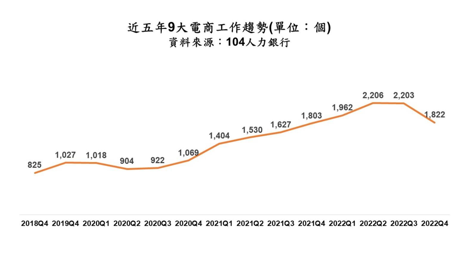 104人力銀行觀察九大電商企業徵才趨勢,2022年第四季平均每月徵才1,822人,屬於2022年的低點,反映疫情紅利略減、景氣向下調整,電商工作數正從高檔回落,但「刷網」已成消費者日常生活,電商工作數仍為五年高點,尤其,47%的工作歡迎社會新鮮人,力邀數位原住民征戰網路市場。