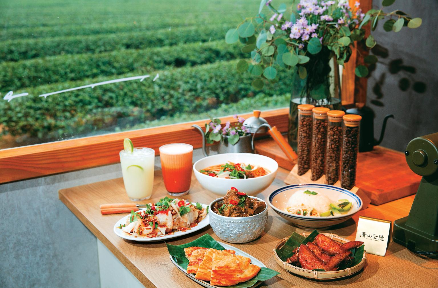 青山雲隱使用新鮮南洋香料,呈現最道地的滇緬泰風味。高人氣的「酸辣海鮮河粉」,以豬大骨、香茅及新鮮檸檬葉,慢熬出基底泰式冬蔭功湯,加入奶水緩和辣度,再以檸檬汁增加酸香,佐入吸飽湯汁口感仍Q彈的河粉,搭配一口當日採買的鮮甜海味,份量十足,卻仍有著讓食客吃到碗底朝天的魅力;讓熟客讚不絕口的「咖哩牛肉飯」口味道地,以新鮮磨製薑黃,炒出馥郁咖哩辛香,加上滑順膠質與筋道嚼勁兼具的紐西蘭牛腱心,燉出濃稠醬汁,無論是搭配鬆軟白飯或香酥的「雲隱甩餅」都風味獨具;以香料醃製入味,炸得外皮酥脆的「雲隱炸雞翅」,和清爽酸甜的「雲南大薄片」是最受歡迎的小點,別忘來杯獨家秘調的「雲隱香檸汁」或滑順郁口的「手標泰式奶茶」增添味覺層次。貨真價實的茶園風光佐味,自然舒心的氛圍,讓人不自覺地細品慢嚼這一方靜謐。