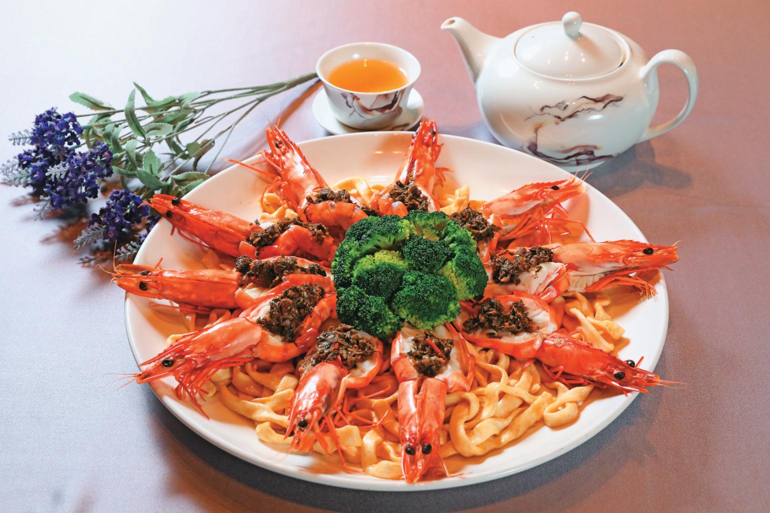 隨著美味的前菜不斷堆疊,越發期待主餐會如何登場。「客家梅香蒸海蝦」以Q彈粄條為基底,擺上如紅寶石般璀璨的紅蝦,在對剖的蝦背上鑲嵌著細碎梅干菜,白晳彈口的肉質、引人食指大動的梅干菜香,再以翠綠花椰菜擺飾成捧花形狀,光是視覺就教人驚喜。林宗賢表示,梅干菜一般習慣跟豬肉做搭配,但是使用草蝦清蒸烹調,不僅更能突顯梅干菜的鹹香滋味,與蝦肉的清甜也十分契合,經由提煉過的海味鮮爽而不膩口。