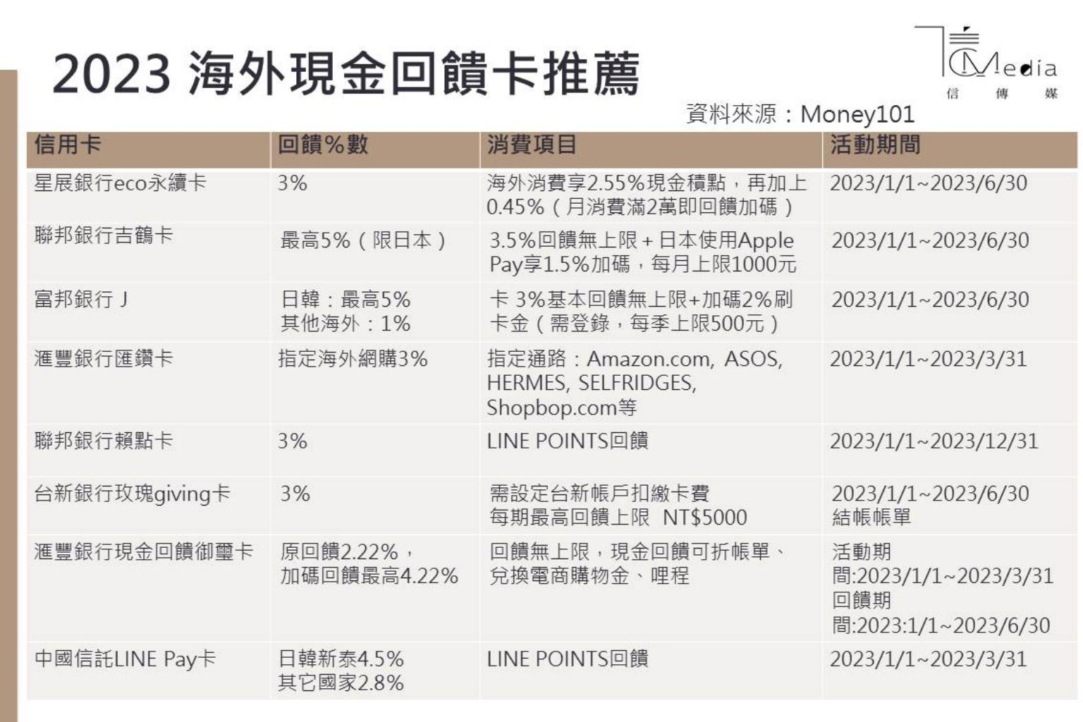 比方說,台新銀行於2018年底發行的FlyGo飛狗卡,一開始推出就是主打旅遊,提供海外消費3%回饋無上限;另外,華南銀行的超鑽現金回饋卡,海外最高打出4%現金回饋;除此之外,遠東銀行的樂家+卡,海外消費最高也祭出5.5%回饋,也可列入參考。