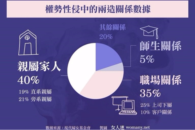 現代婦女基金會執行長林美薰指出,基金會在2014至2016年間,共服務了761件性侵害案,其中權勢性侵有129件、佔了17%,而權勢性侵案中的兩造關係數據,前3名為「上司下屬」、「旁系親屬」及「直系親屬」。
