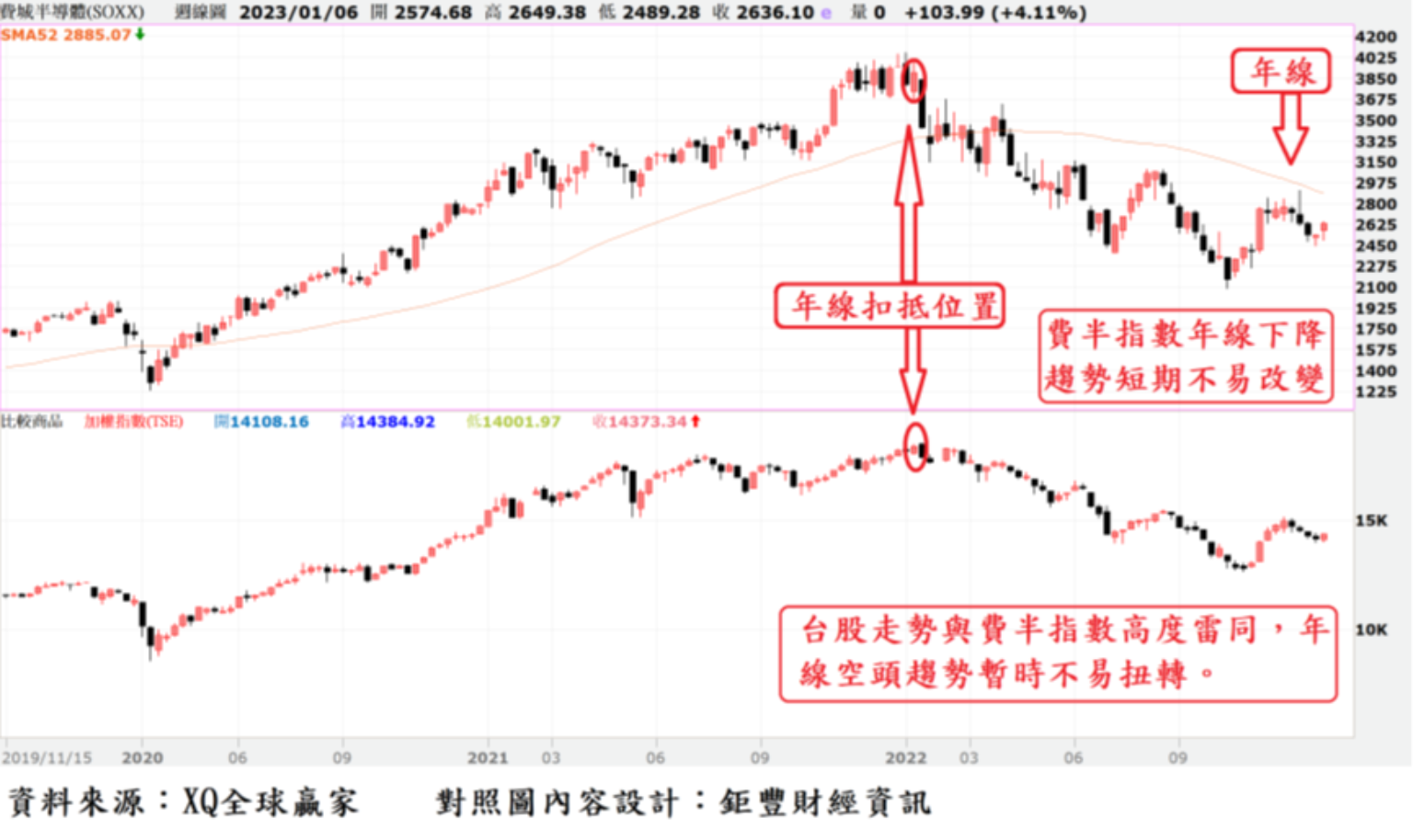 台股走勢與費城半導體指數走勢亦步亦趨,兩者高度相關,台股指數去年11月大漲14.9%,12月回跌4.99%,強勢反彈格局尚未完全遭到破壞,但半年線、年線跨2023年後,仍維持下滑的空頭格局,年線空頭循環走勢尚未改變。
