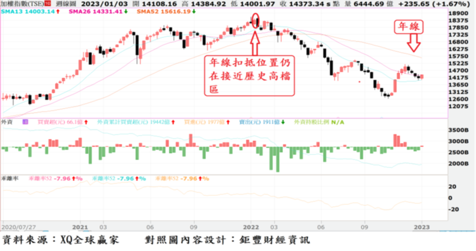 台股指數至1月06日收盤14,373點,代表長期多空趨勢的年線(15,616點),已第33周下滑,倒數52周、年線扣抵位置為2022年1月10日當周收盤指數為18403點,未來四周平均扣抵點數為18,071點,未來13周平均扣抵點數為17,709點,代表未來1個月指數必須回升至18,000點、未來3個月指數必須回升至17,700點之上,台股指數年線方可重新回到上升的多頭趨勢,顯見台股年線在2023年3月底前欲扭轉多空趨勢並不容易。
