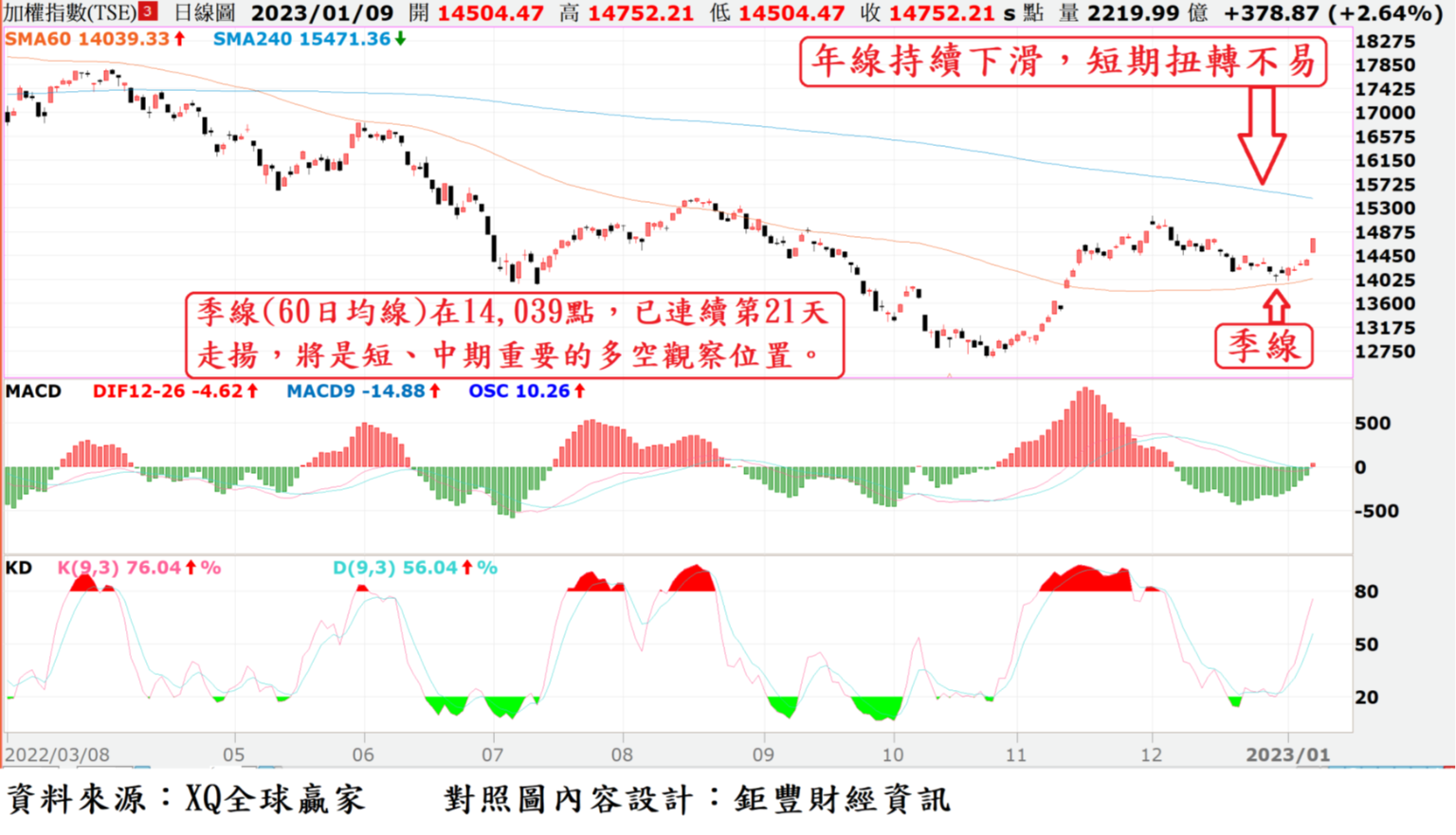 圖、台股日K線與年線季線趨勢圖(至1/09/2023)