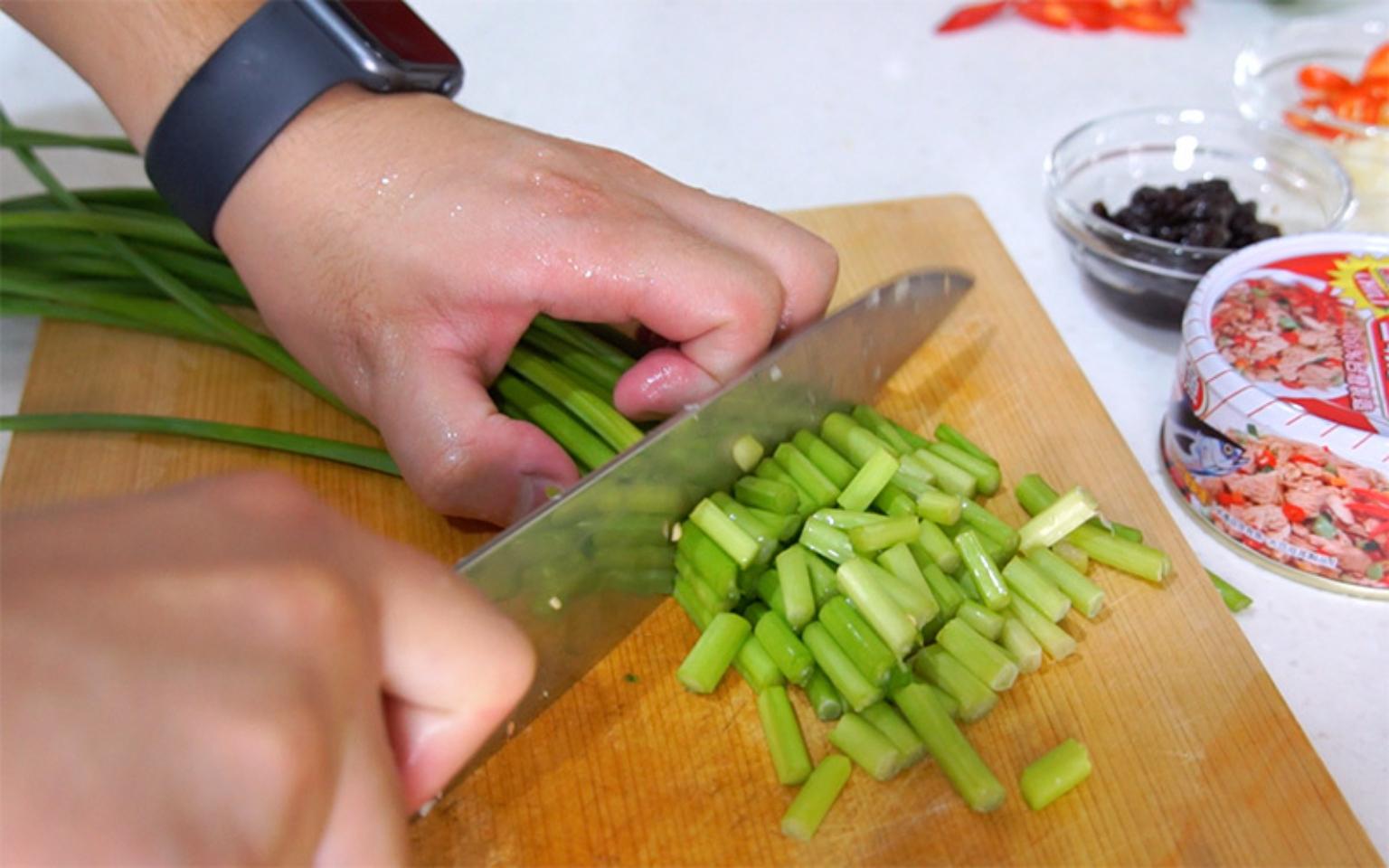備料:韭菜花切小段,切蒜片與辣椒片。