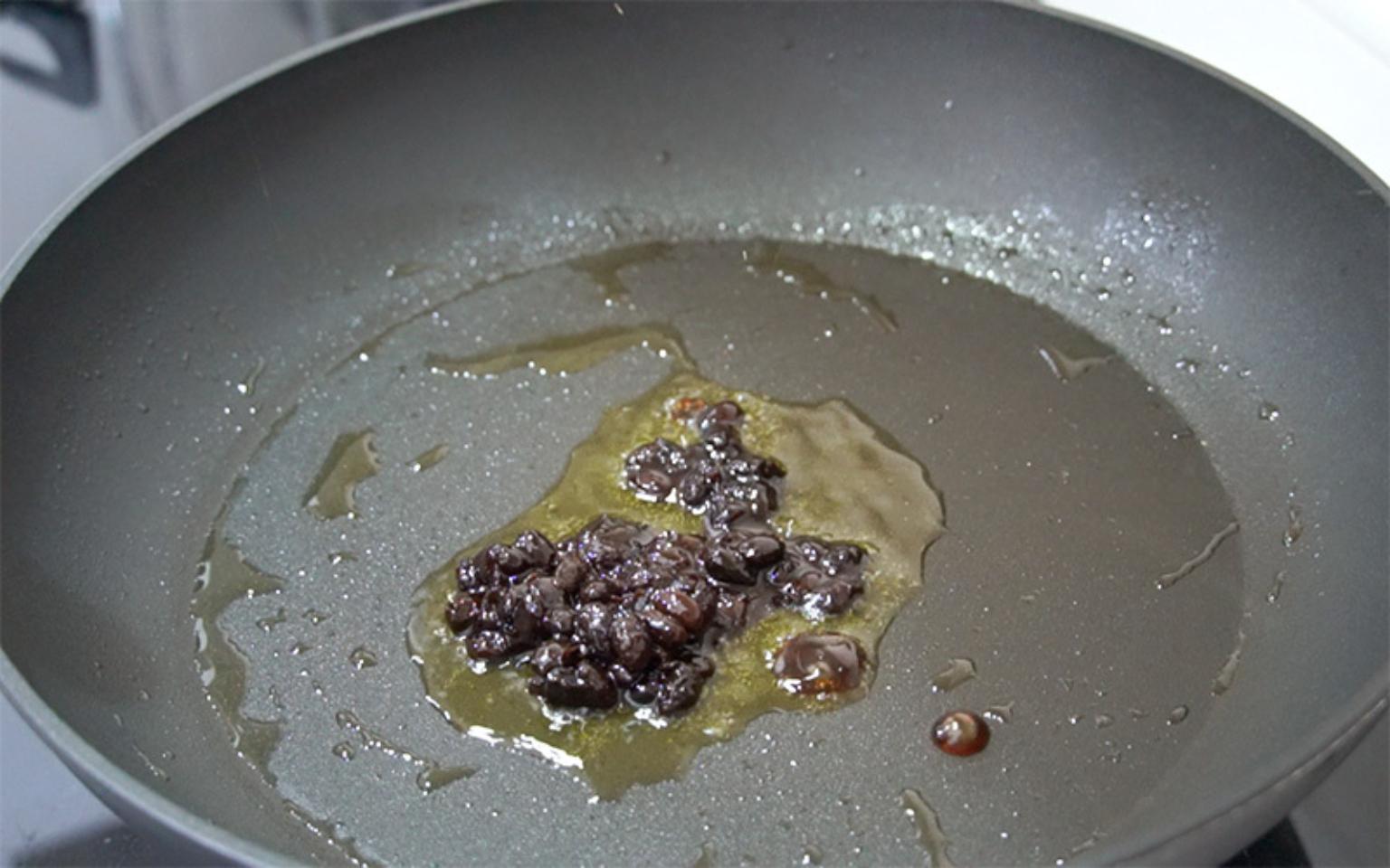 鍋子加油熱鍋,先加入豆豉爆香。再接著加入蒜頭與辣椒一起爆香。