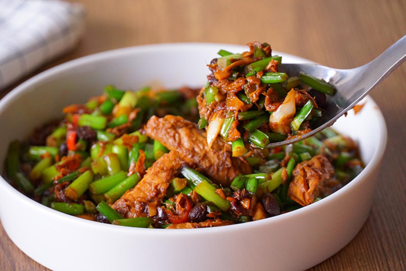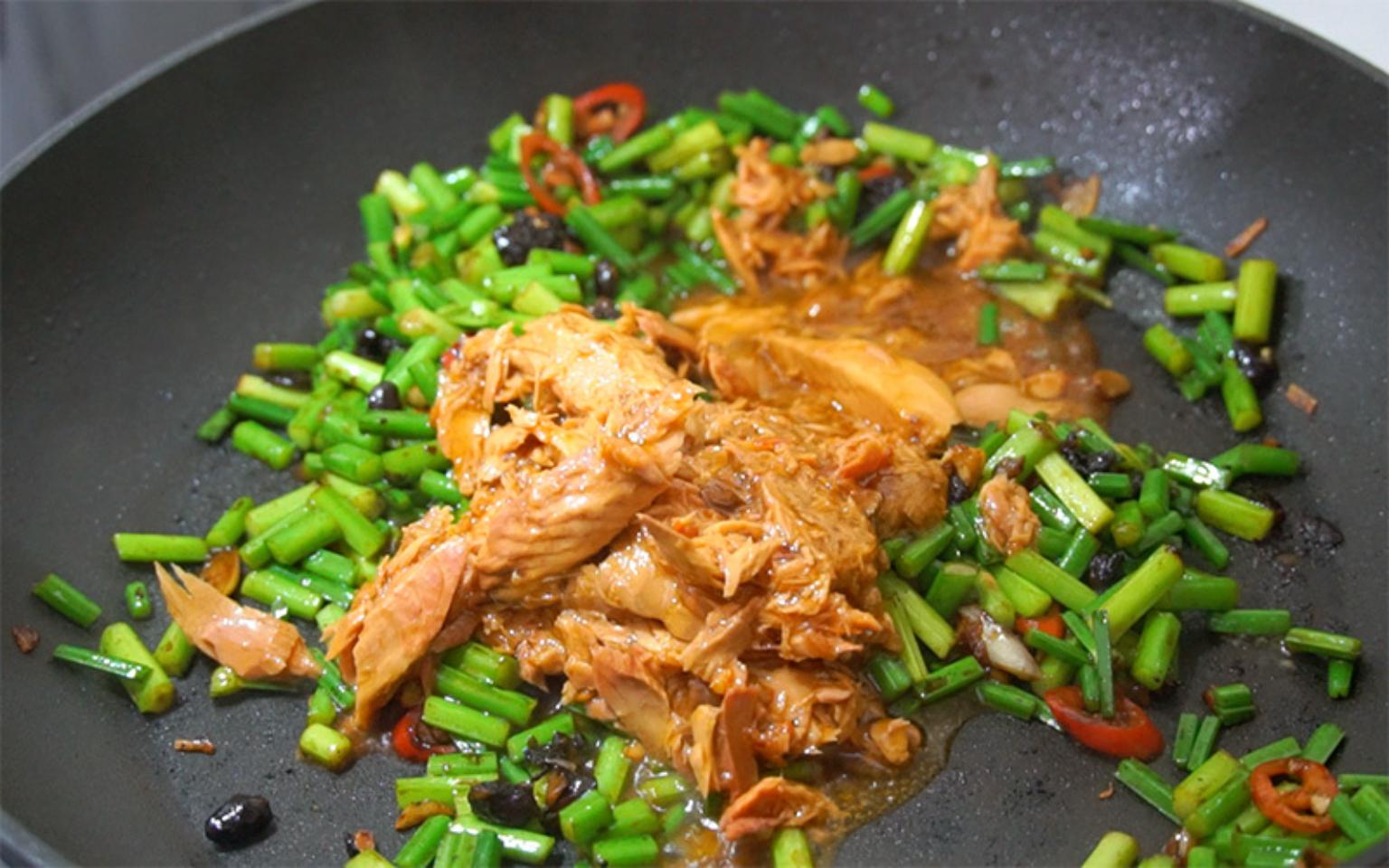 最後加入麻辣鮪魚罐頭,拌炒均勻後即可起鍋裝盤。