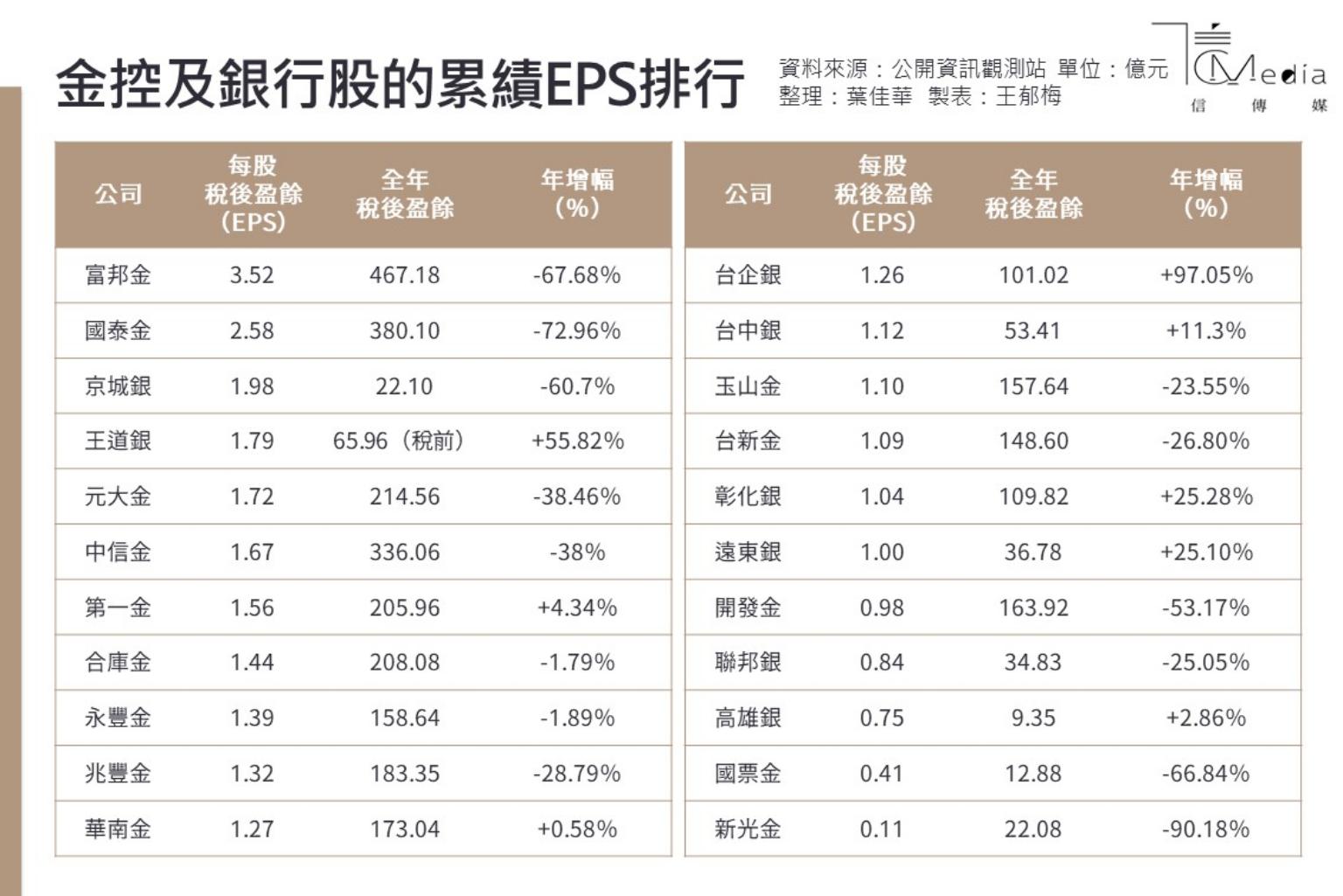 這也讓2022年的金控每股稅後盈餘(EPS)排名有較大幅度的洗牌,比方說以銀行、證券獲利為主的金控,全年的EPS排名跟往年比已有明顯的進步。